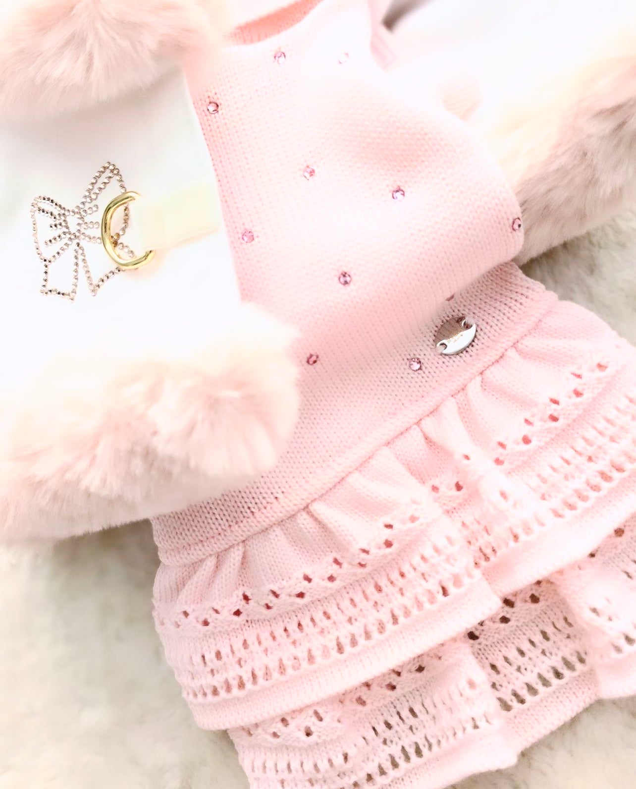 Un Dolcissimo ed elegante abito in pure lana vergine , morbido e dai dettagli inimitabili , arricchito da punti luce swarovski in tinta , la gonna lavorata e i dettagli di questo prezioso abito lo rendono unico e perfetto per le vostre principesse