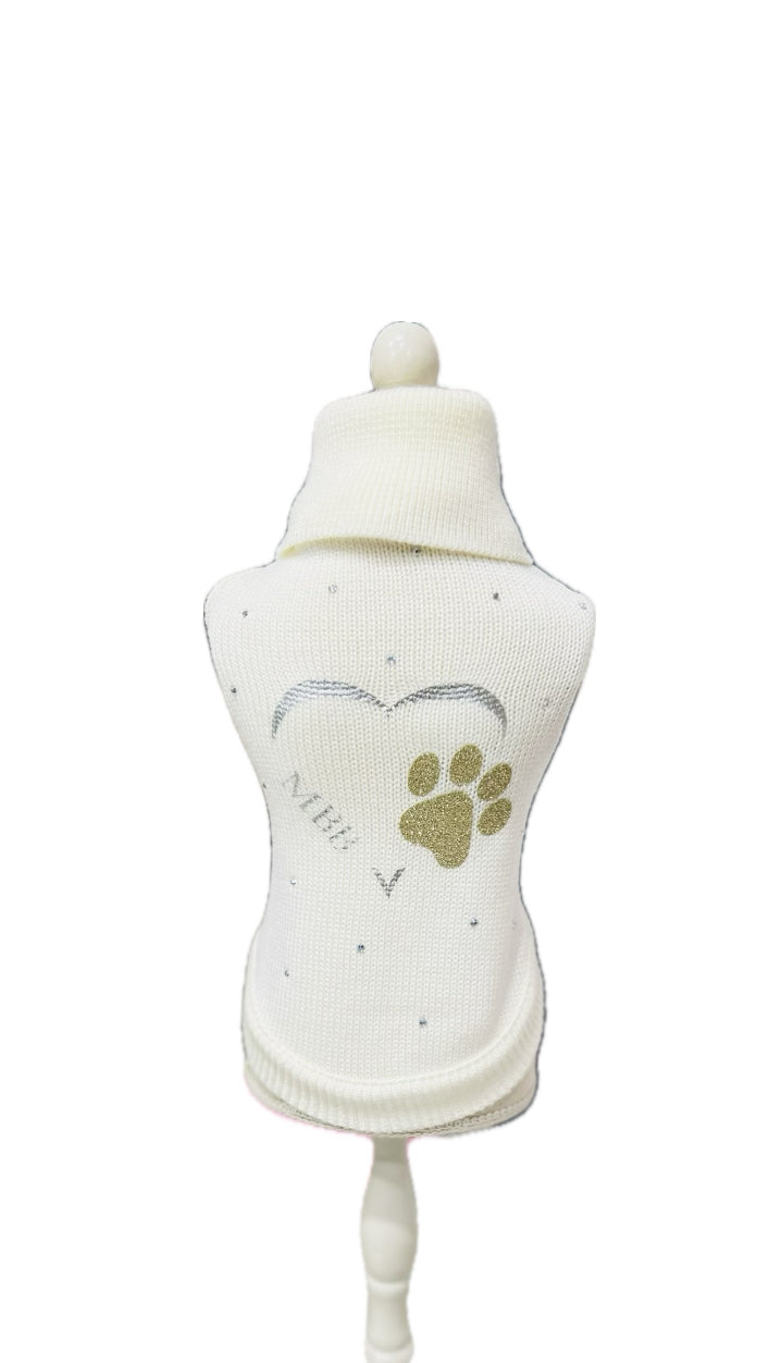 Elegante e prezioso pull in Lana vergine collo alto in color crema Arricchito da preziosi punti luce Swarovski e un dolce patch logo con zampina in glitter oro