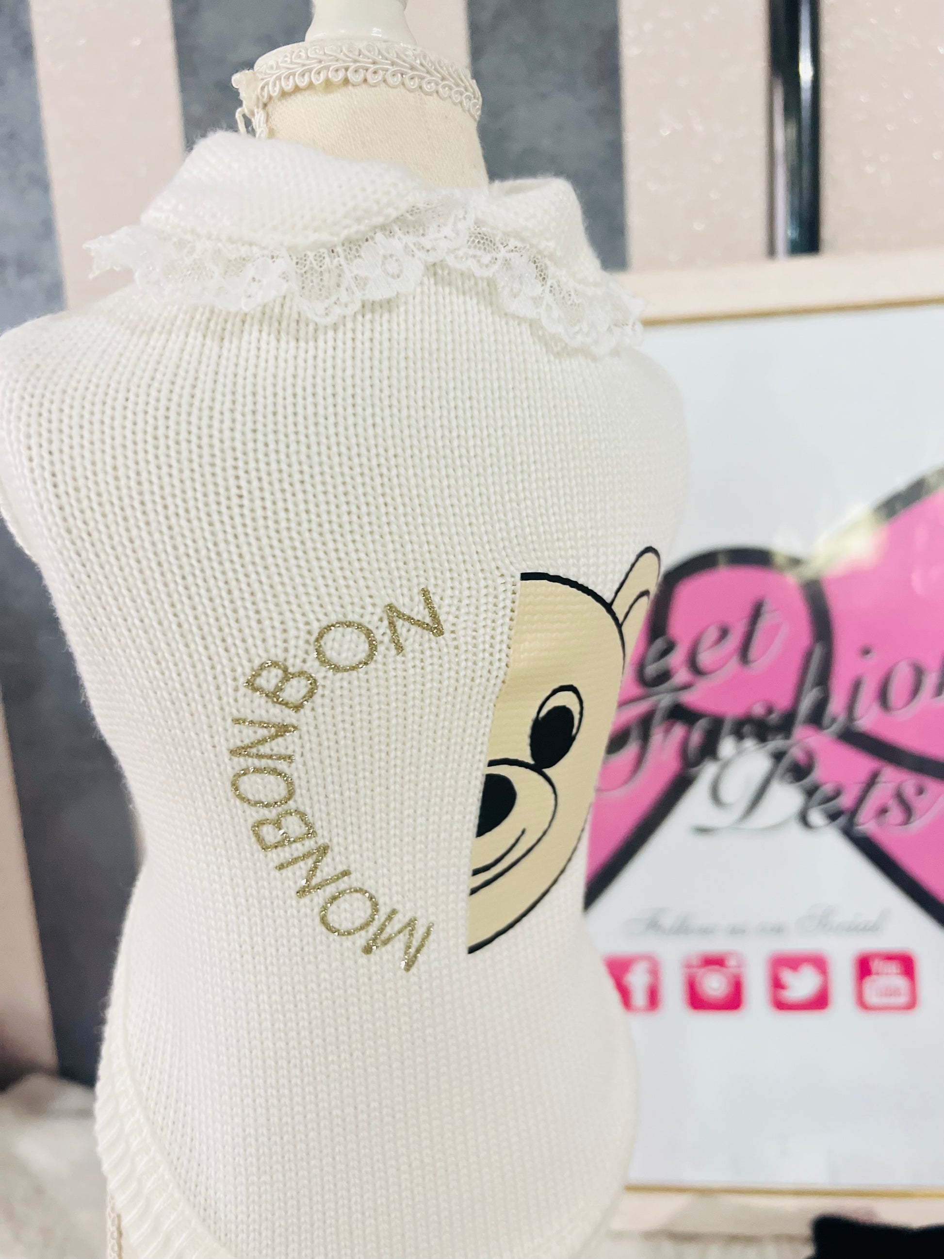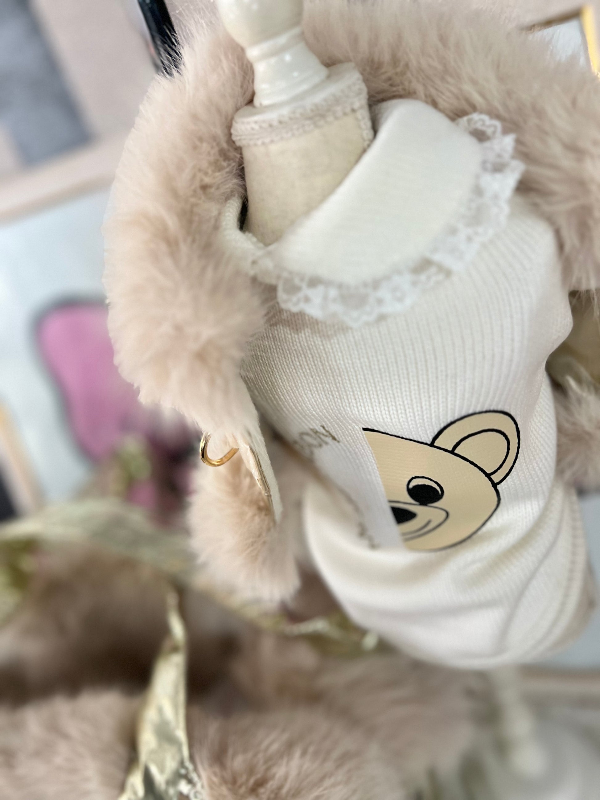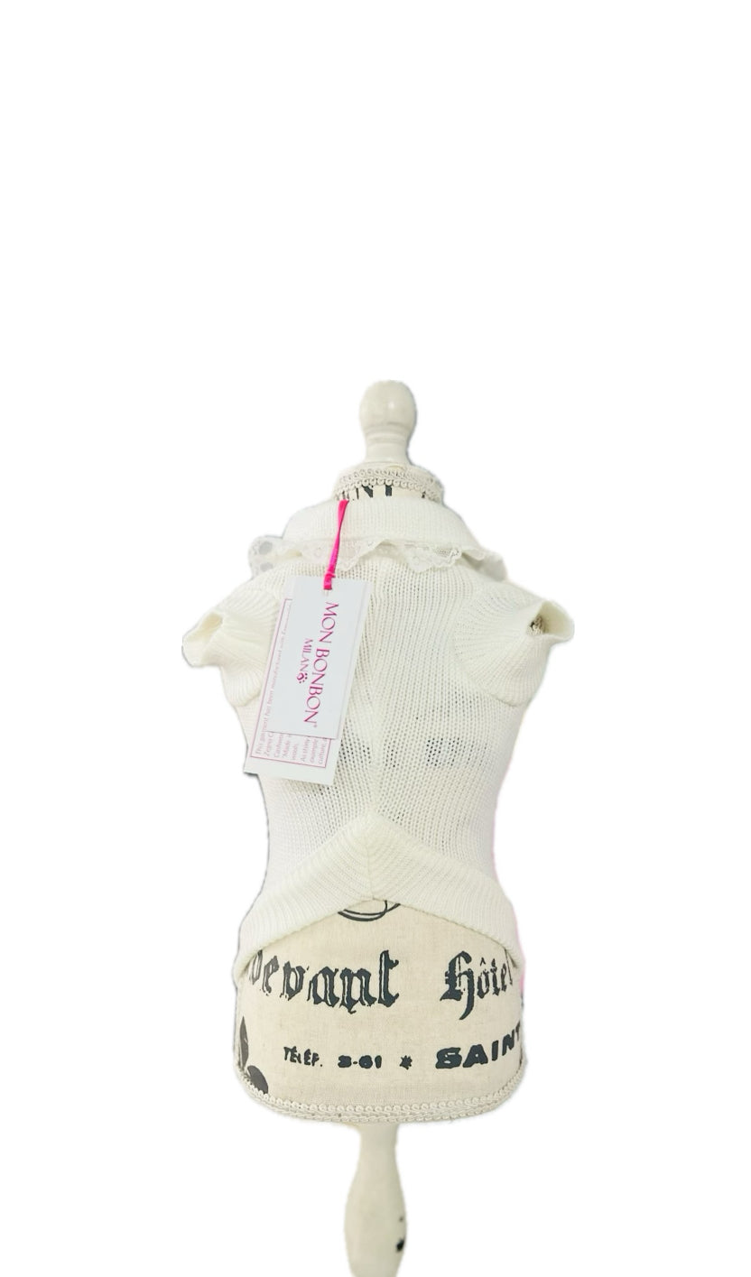 Dolcissimo pull in pura lana vergine con un delizioso scollo a bambola , arricchito da un delicato pizzo .
