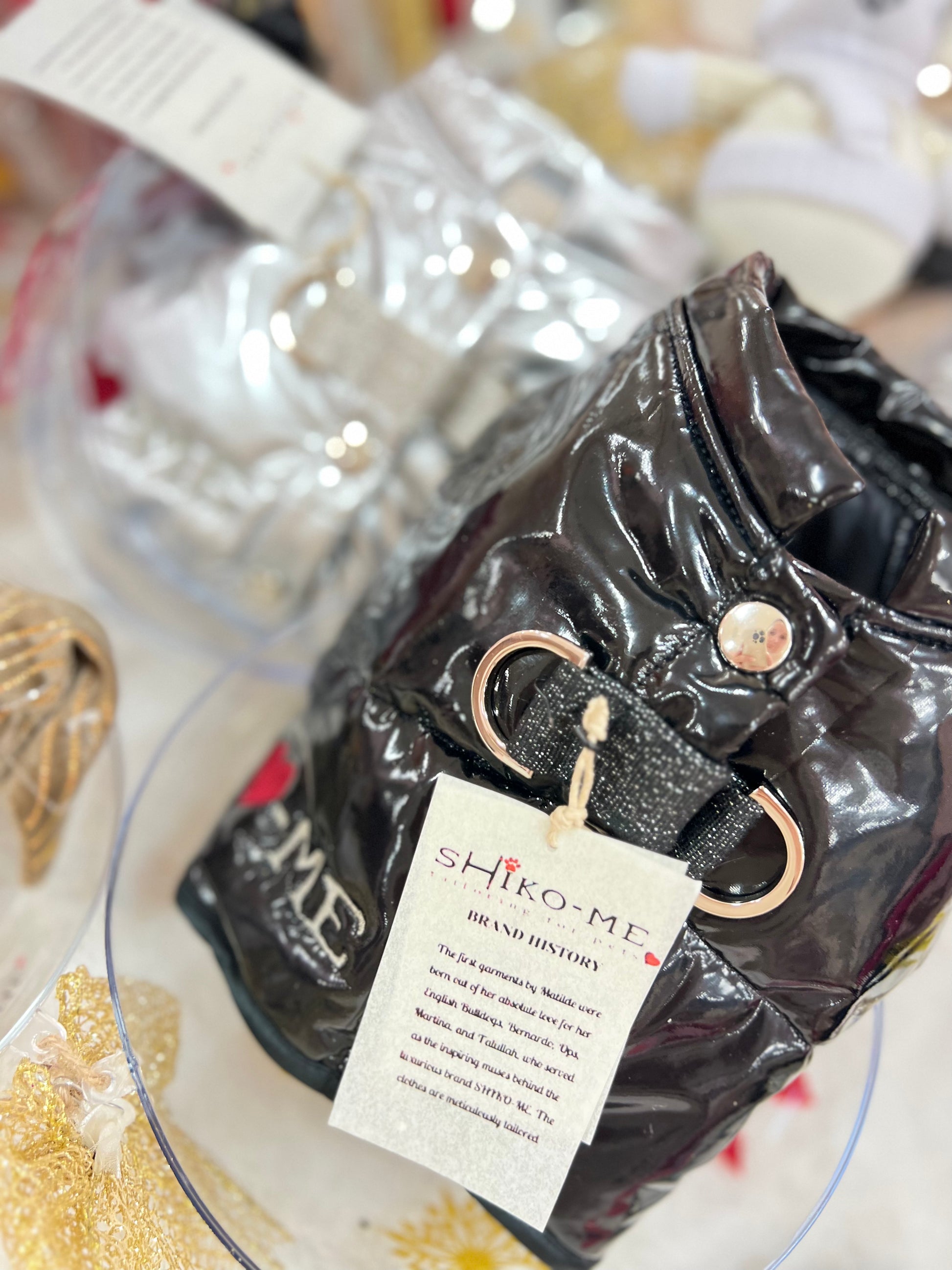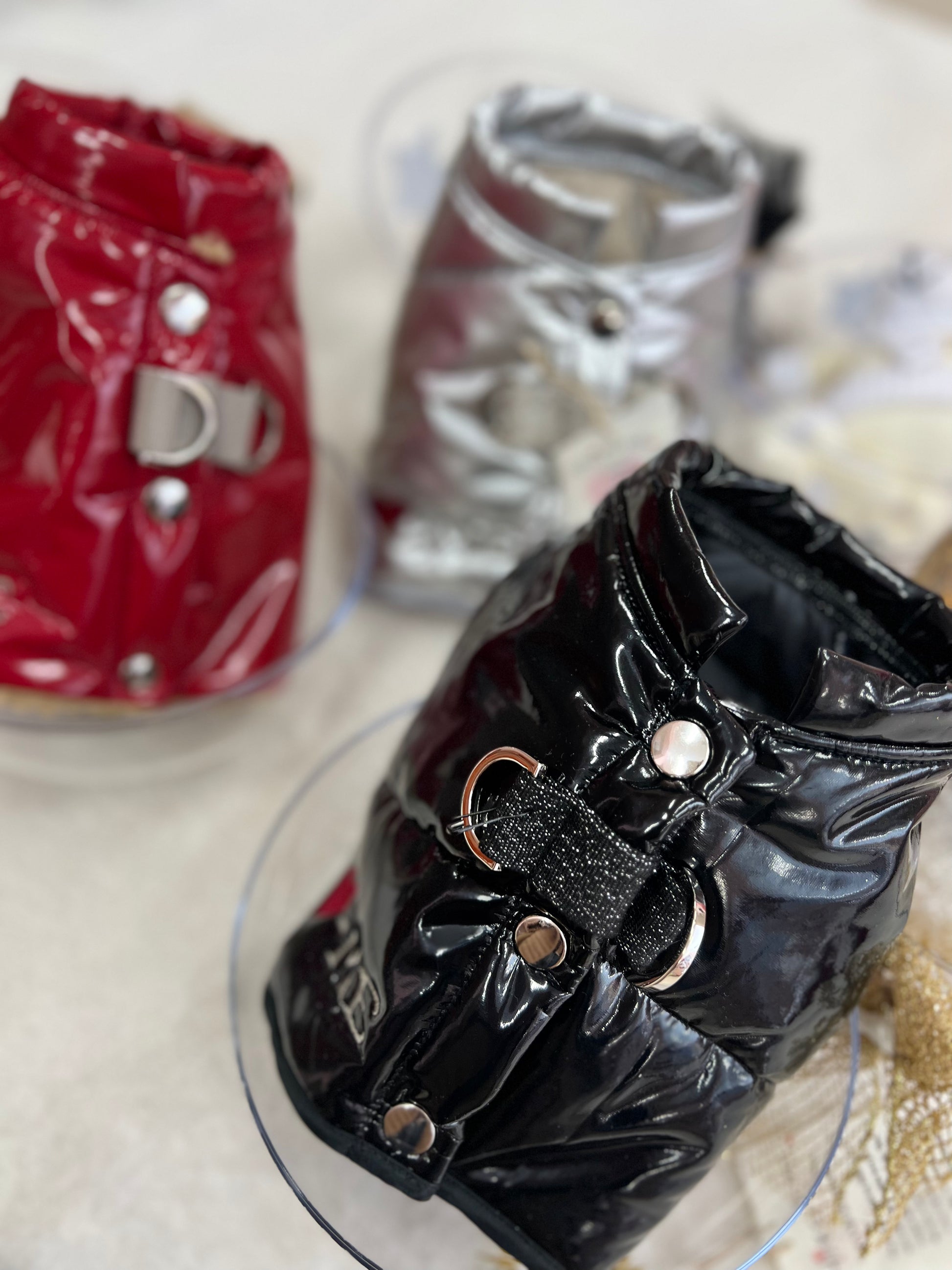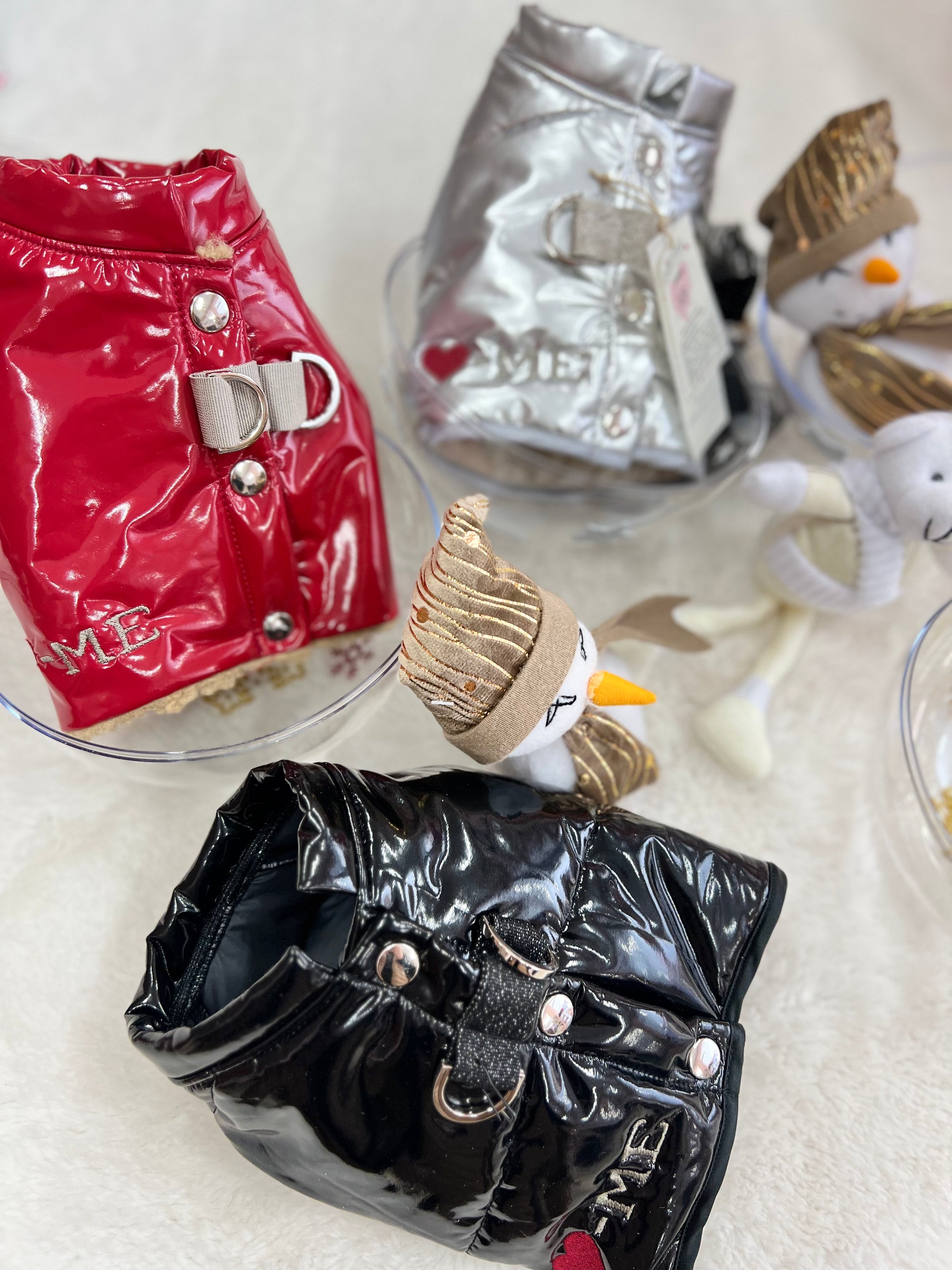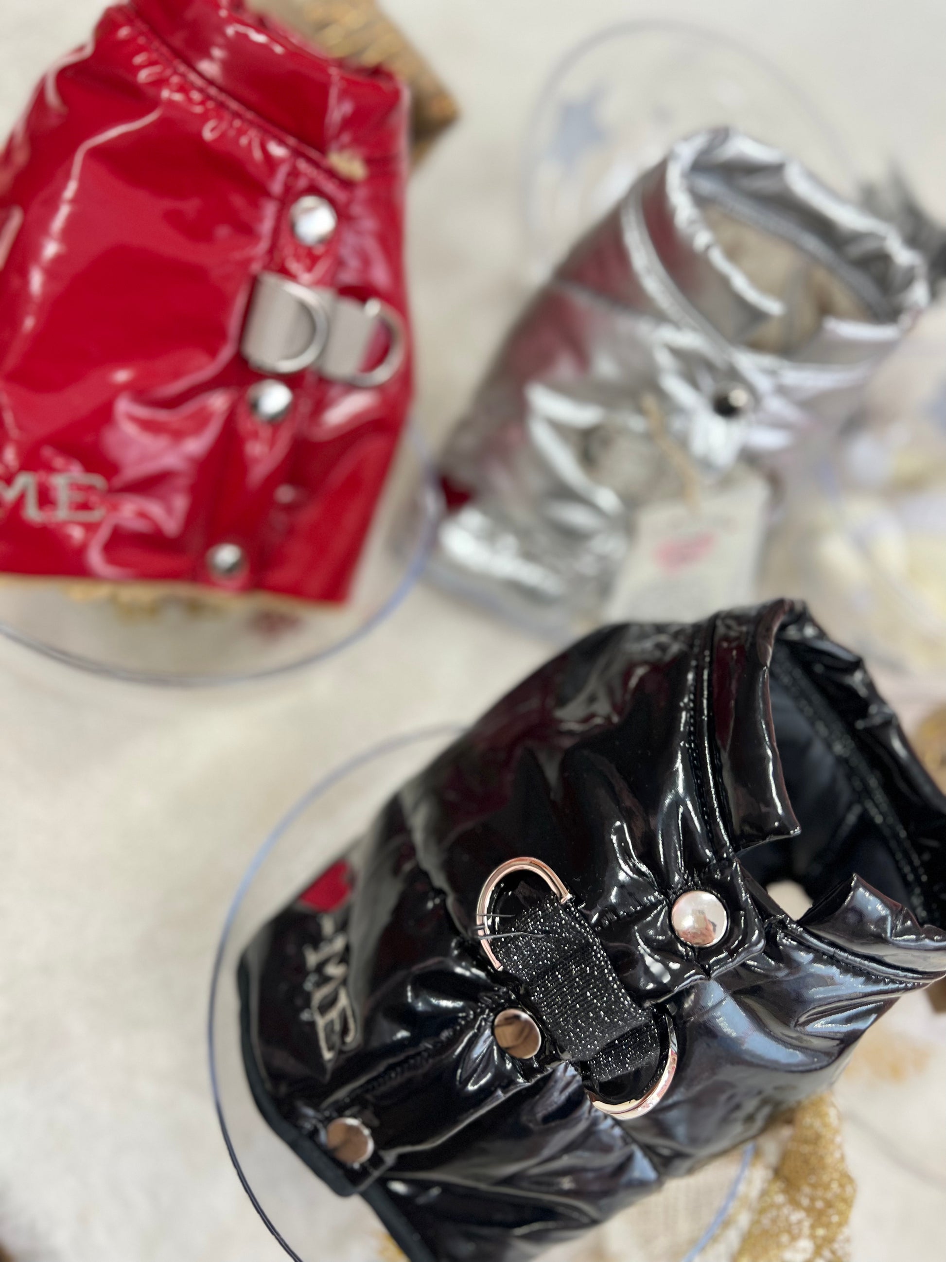 fantastica pettorna effetto vernice , interno anti nodo stile bomber , abbottonatura snap , disponibile in tre colori .. in una dolce confezione natalizia con all'interno un peluche natalizio