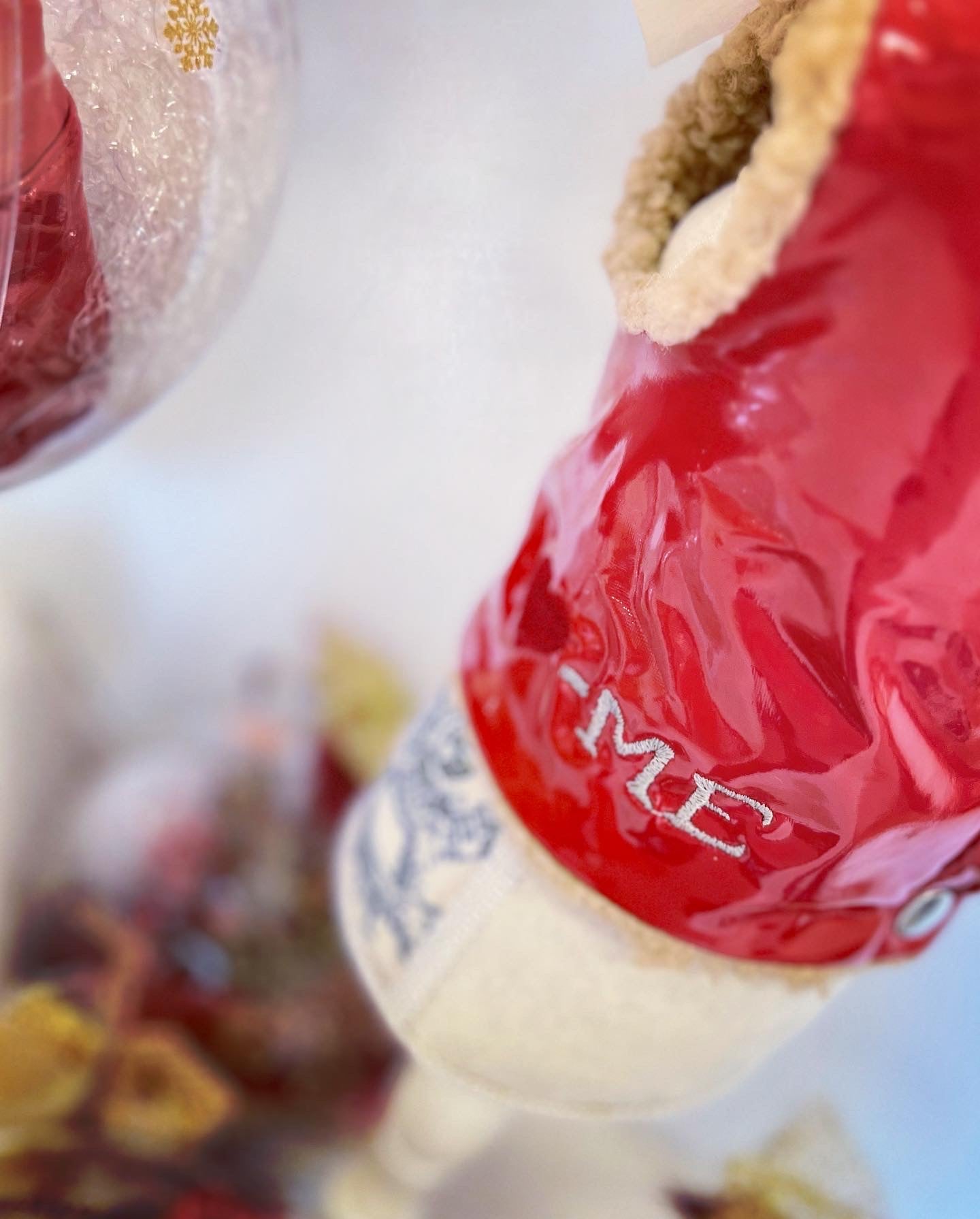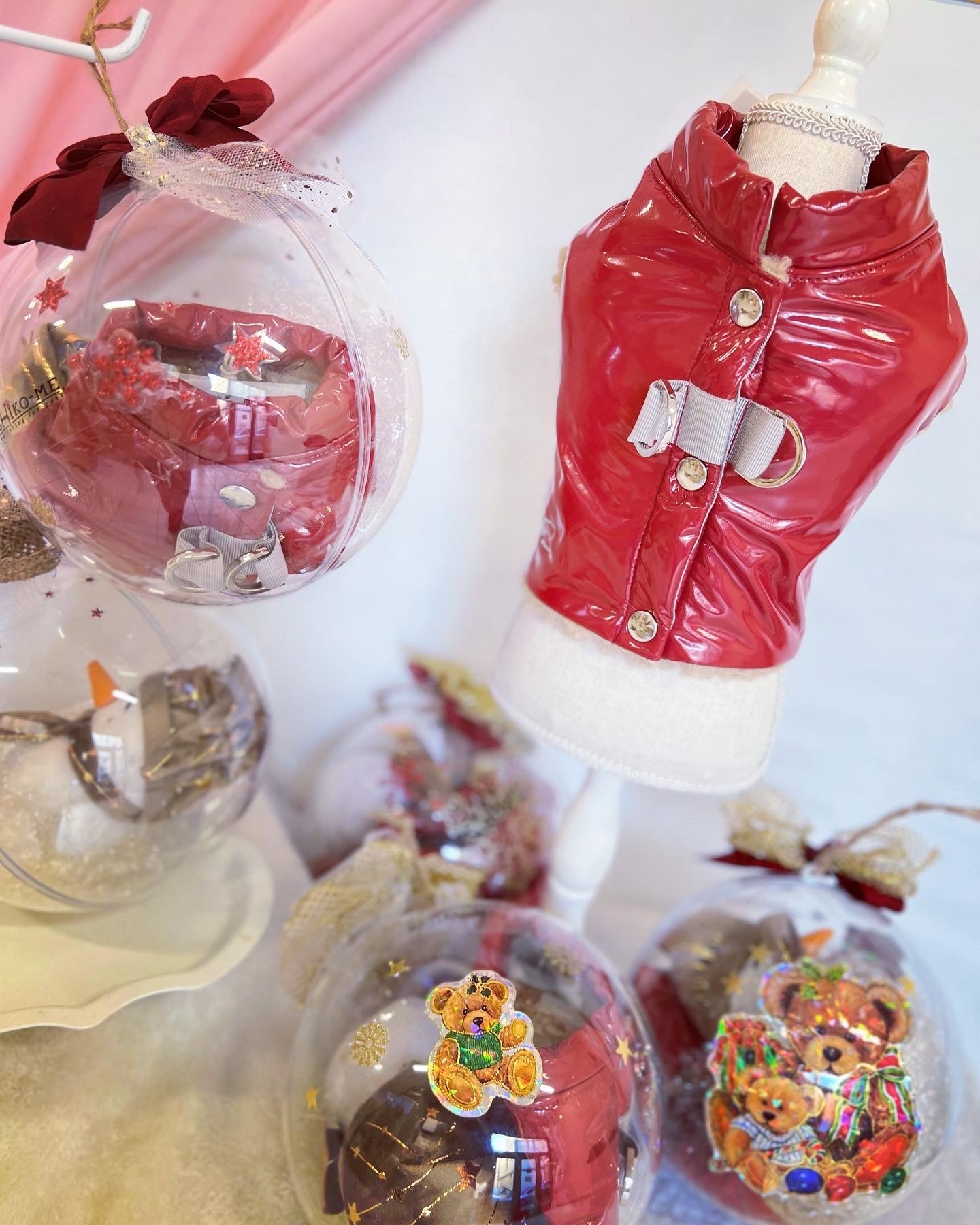 fantastica pettorna effetto vernice , interno in orsetto , abbottonatura snap , disponibile in tre colori .. in una dolce confezione natalizia con all'interno un peluche natalizio