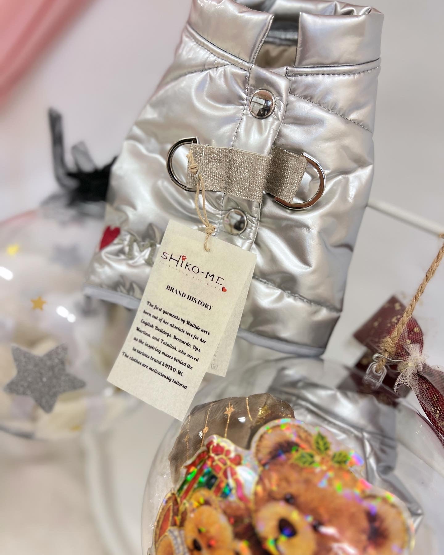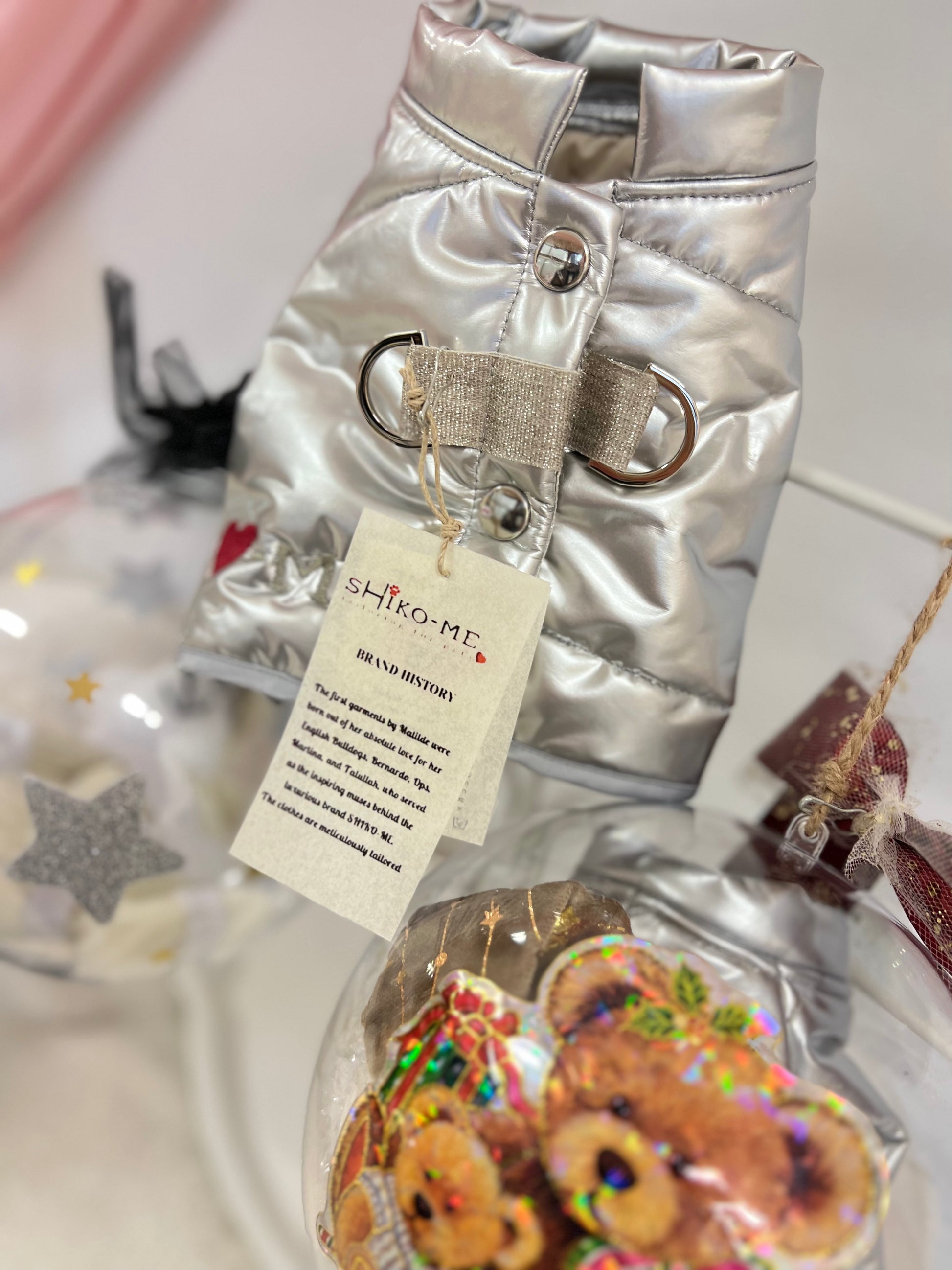 fantastica pettorna effetto vernice , interno anti nodo stile bomber , abbottonatura snap , disponibile in tre colori .. in una dolce confezione natalizia con all'interno un peluche natalizio