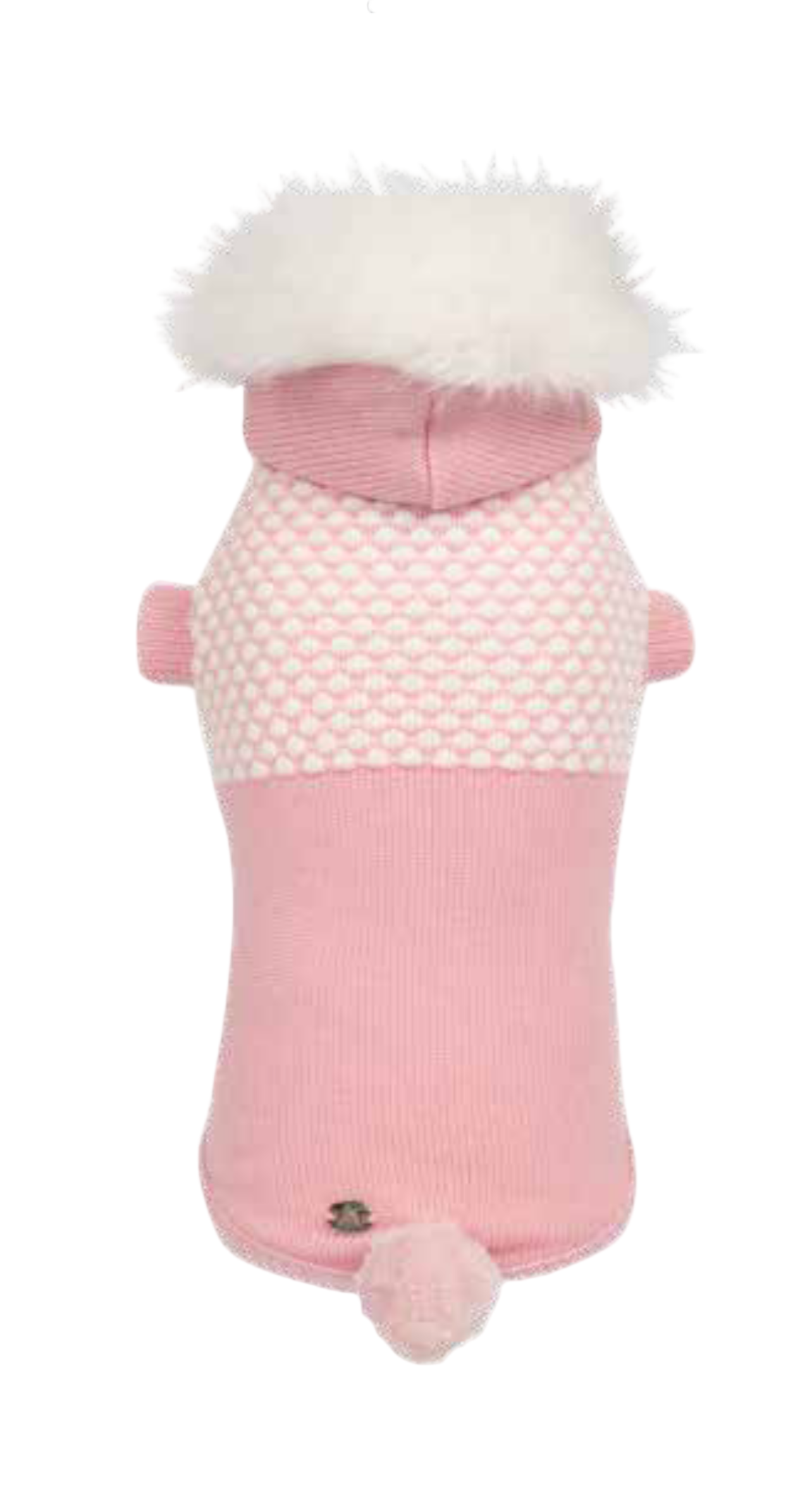 Elegante pull in lana Zegna in bianco e rosa , cappuccio arricchito da ecofur