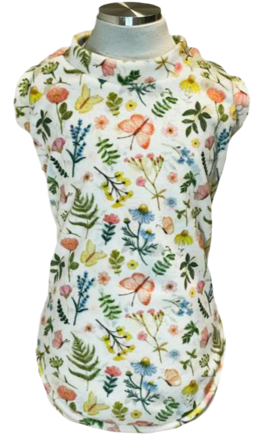 T shirt in ciniglia morbidissima con fantasia di fiori primaverili e farfalle