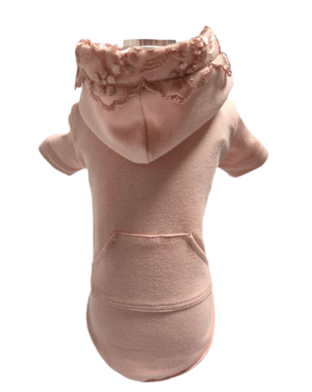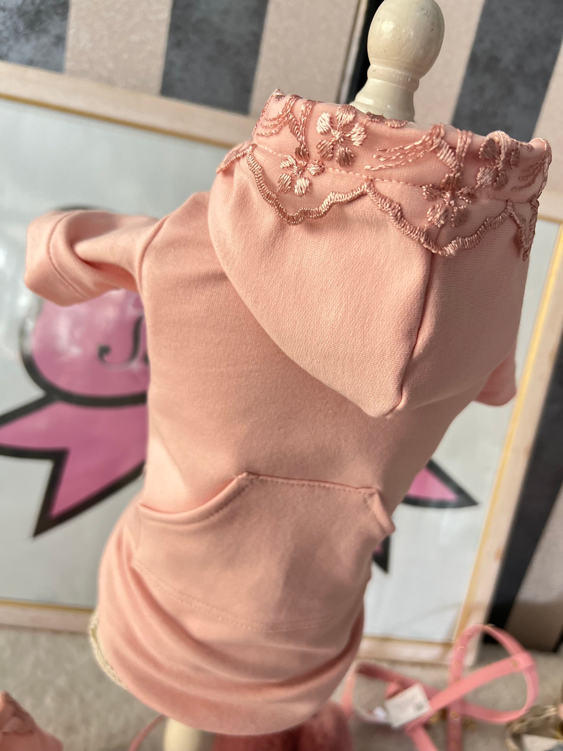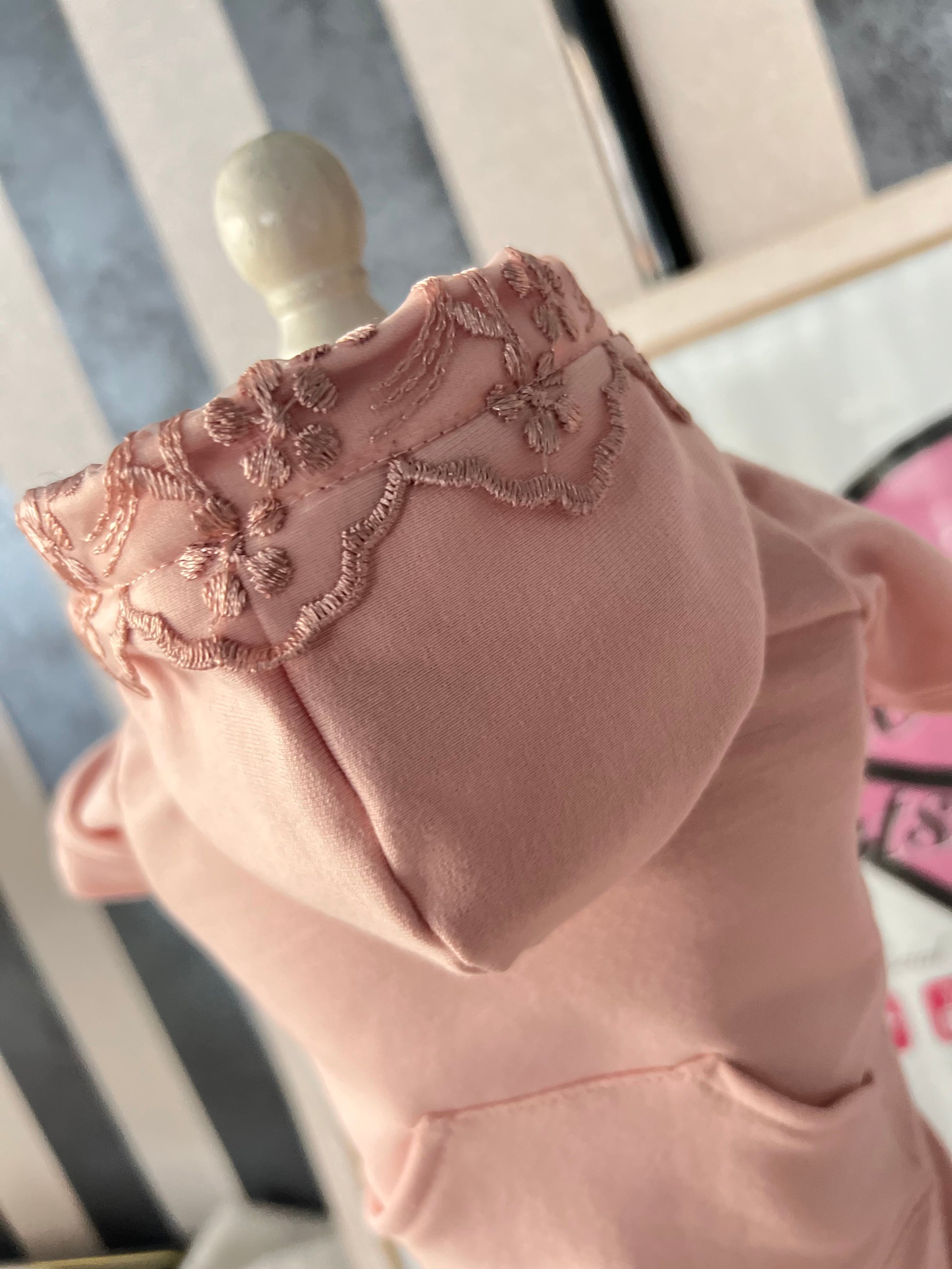 Dolce Felpina con capouccio in color pesca arricchita da un delicato ed elegante pizzo fiori sul cappuccio
