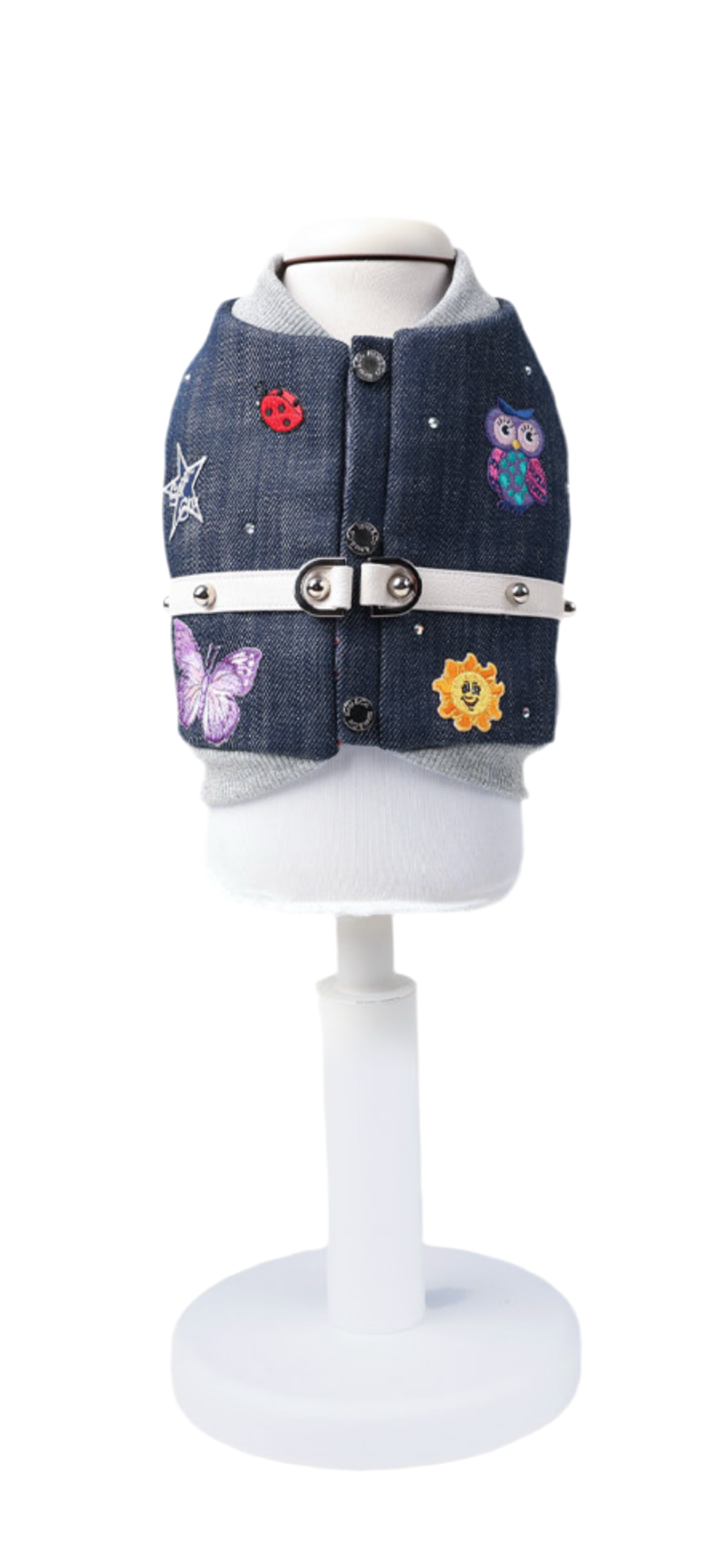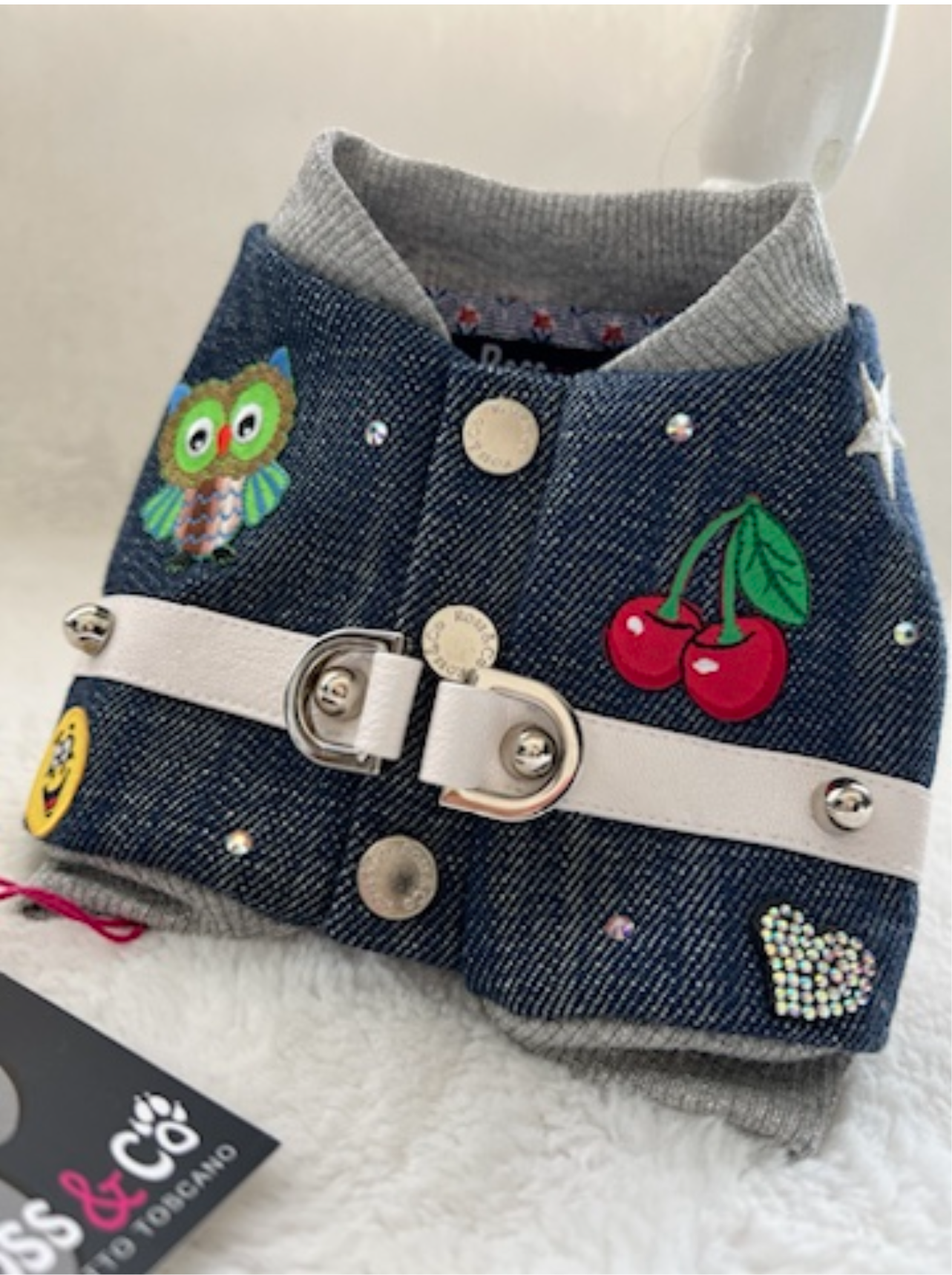 Tailoring Harness in cotone jeans e Patch , caratterizzata da un accattivante stampa Diabolik sul pancino ,rifinita con bordi in maglia elastica, foderata in raso antinodo e abbottonatura.