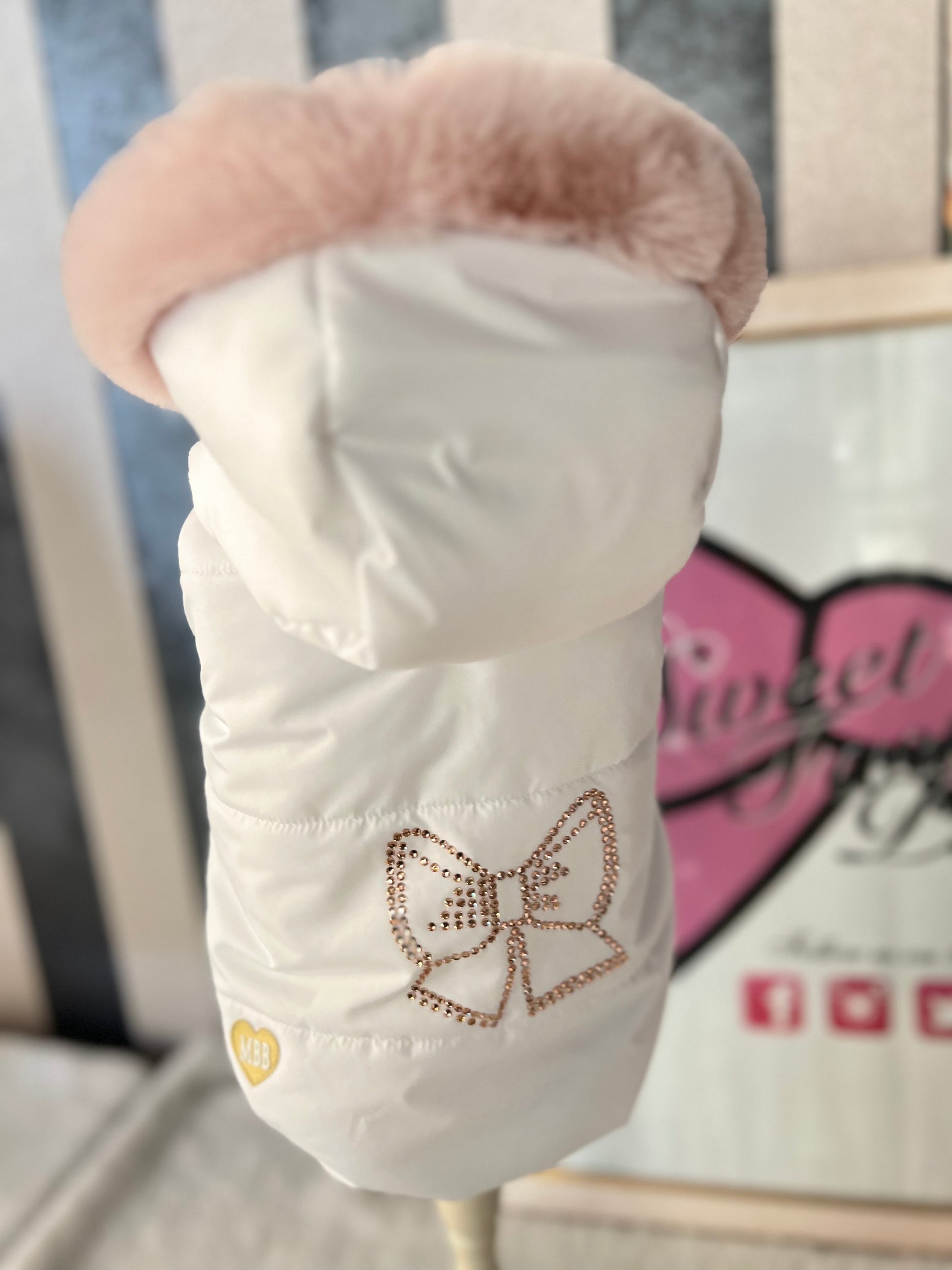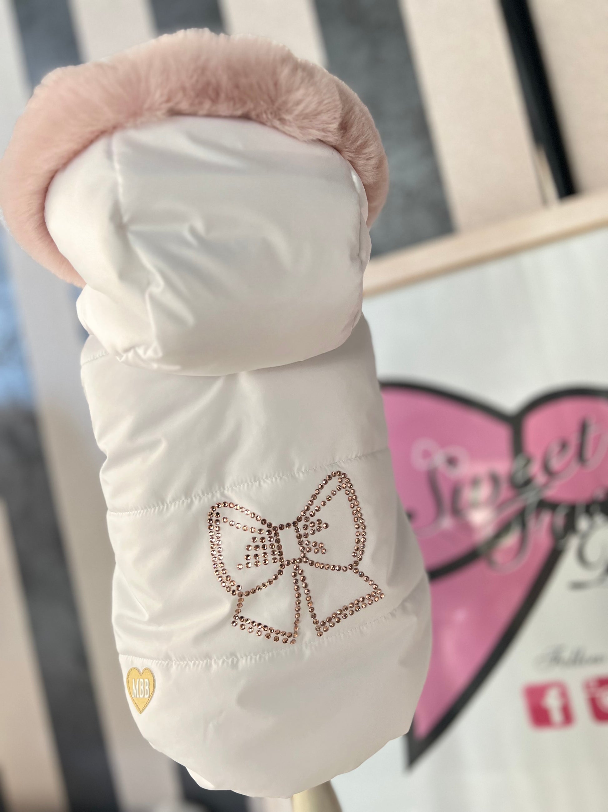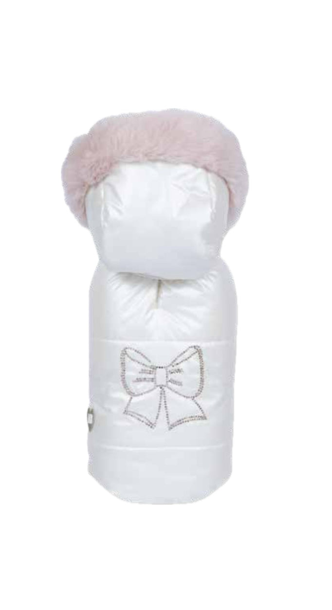 Soffice piumino Bianco con applicazione di un elegante Fiocco Swarovski Rosa
