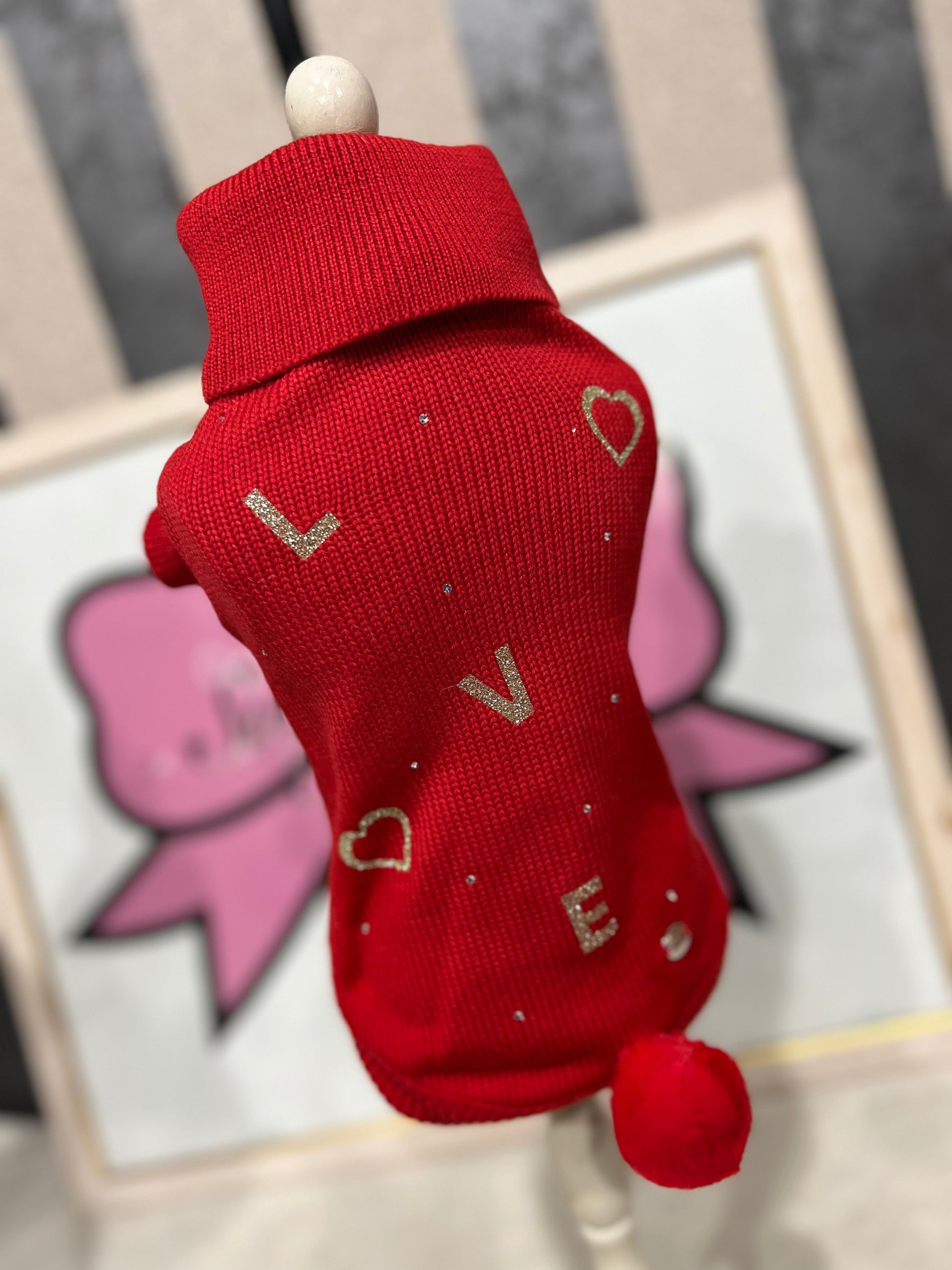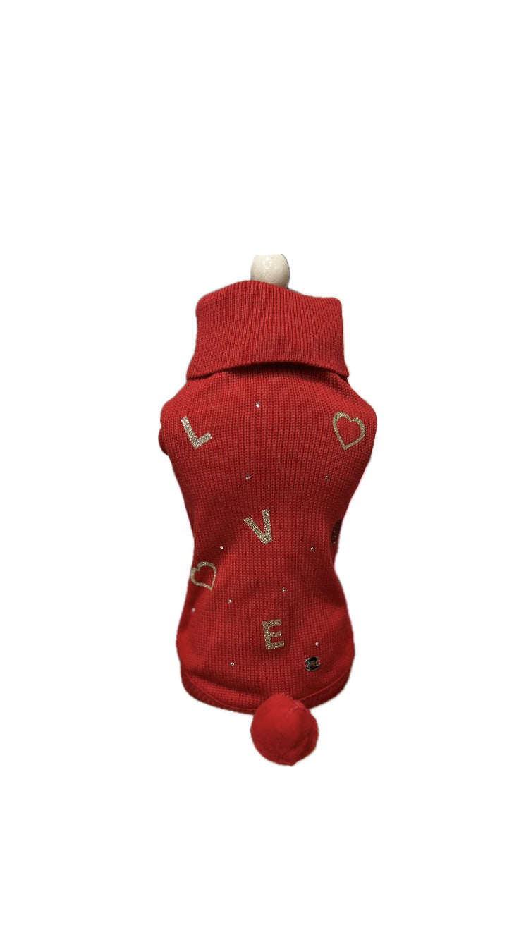 Prezioso Pull in Lana Zegna Rossa , arricchito da patch a formare la scritta love in glitter e vari punti luce swarovski , un delizioso ponpon lo rende ancora più dolce