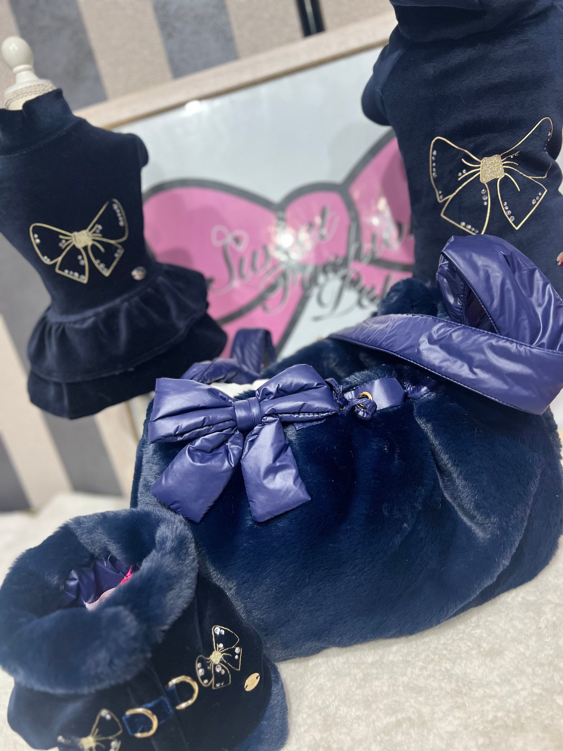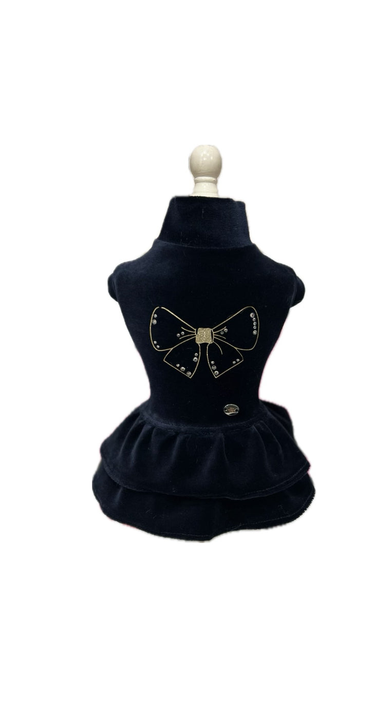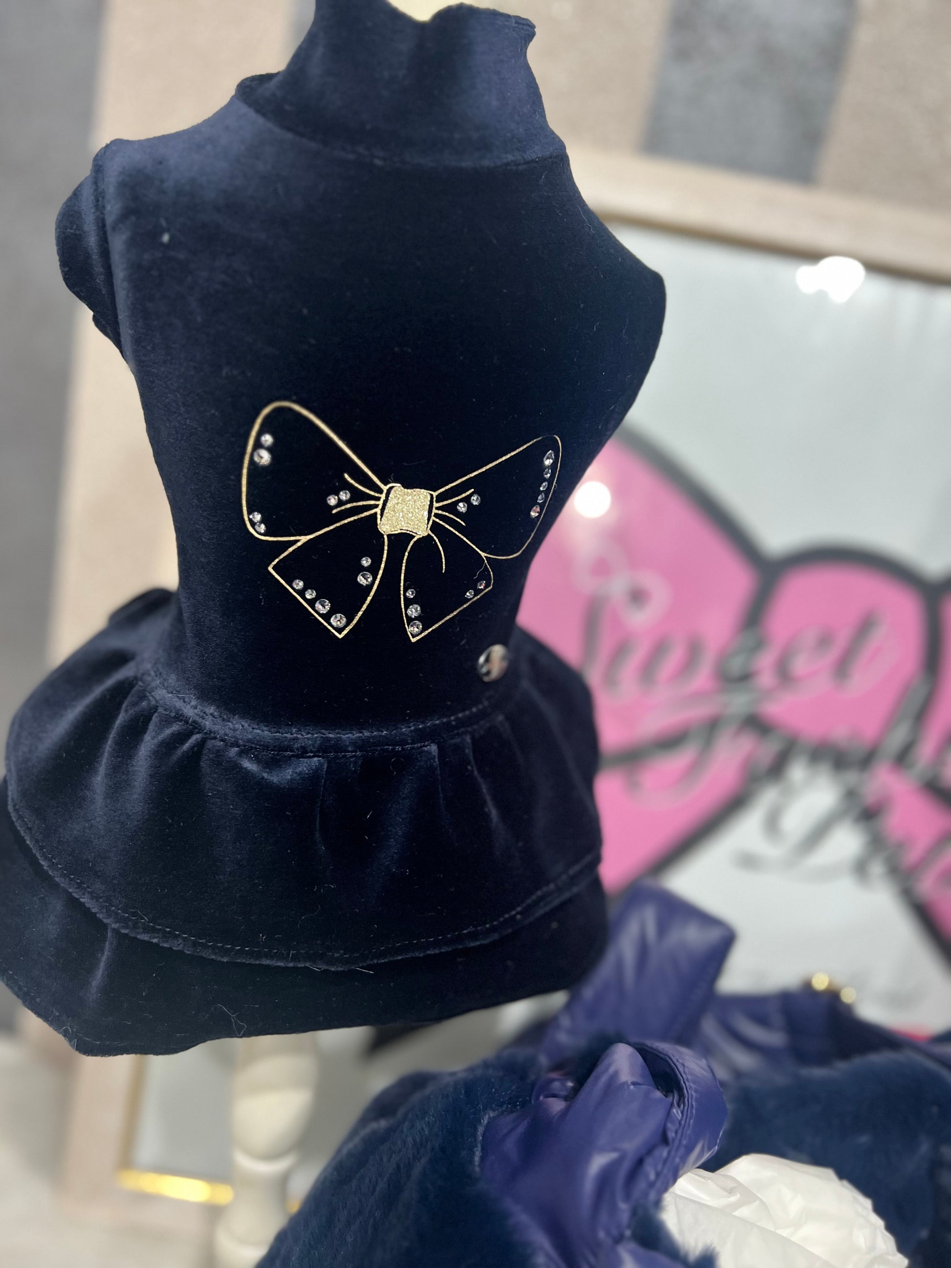 Elegante Abitino in velluto Blu notte arricchito da un fioccho patch in oro e cristalli swarovski , gonnellino a balze dolce e sofisticato