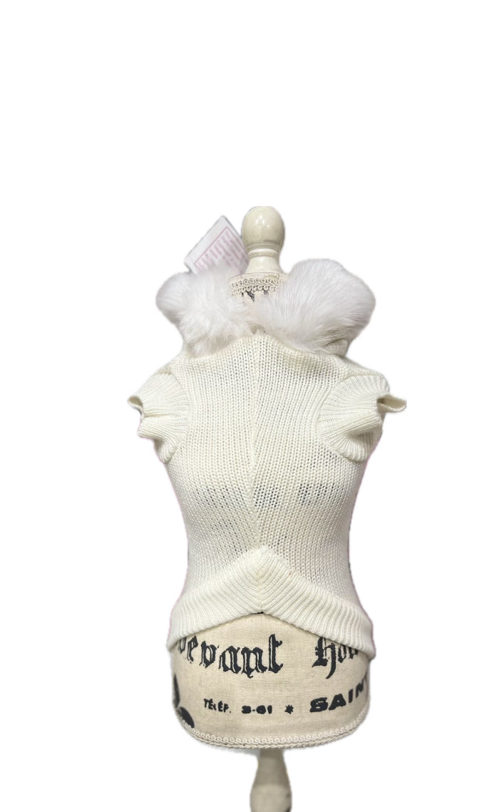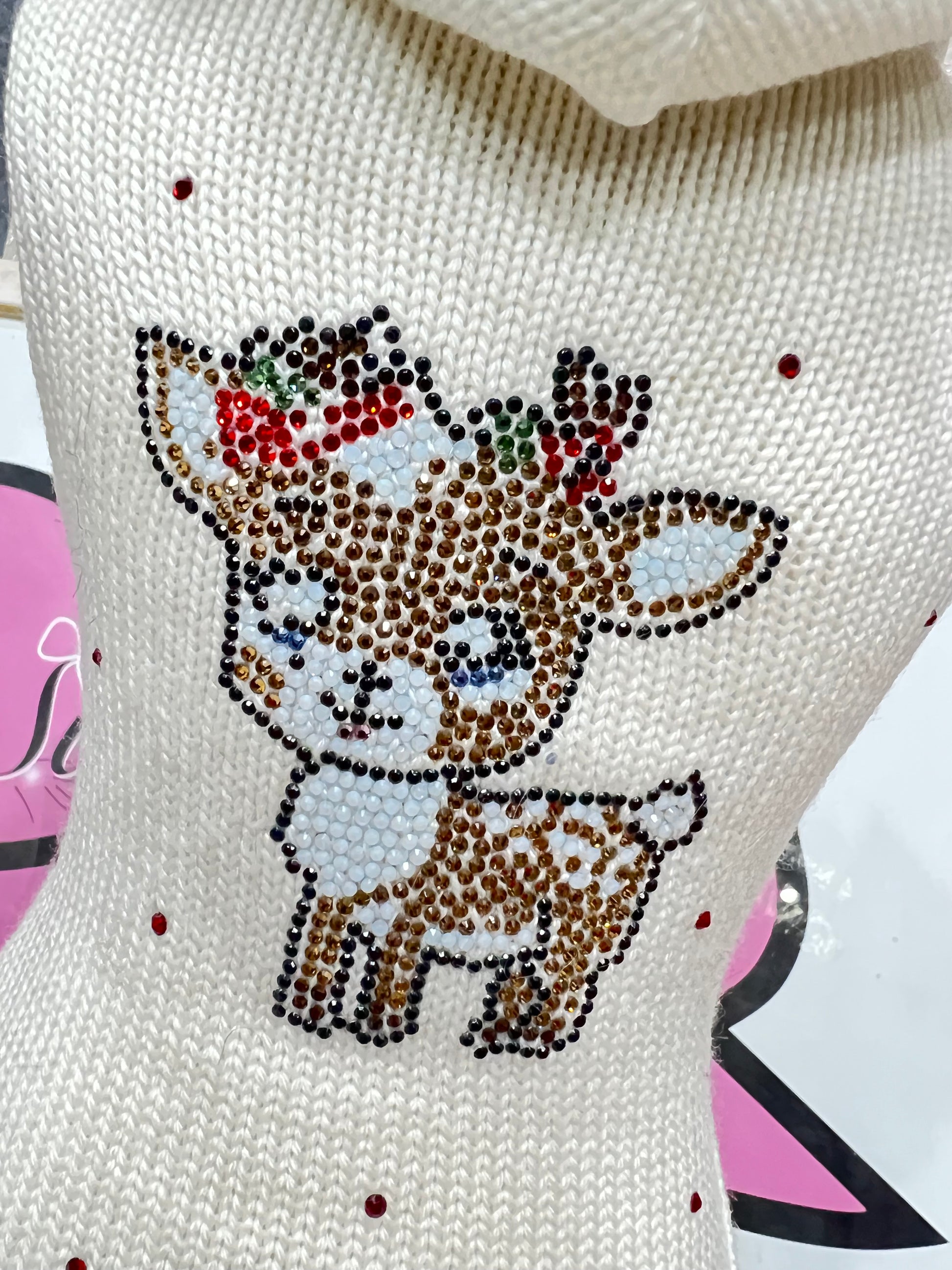 Prezioso Pull in Lana Zegna Arrichito da una dolcissima renna completamente realizzata in cristalli Swarovski , ounti luce swarowski in rosso e cappuccio con ecofur