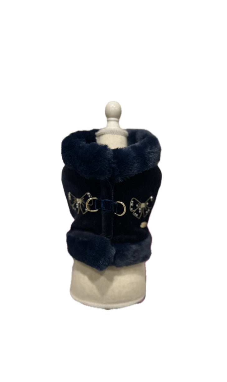 Elegante pettorina Tailoring in velluto Blu notte arricchito da due fiocchi patch in oro e cristalli swarovski , apertura sul in velcro ecofur tono su tono e interno rivestito in tessuto raso anti nodo