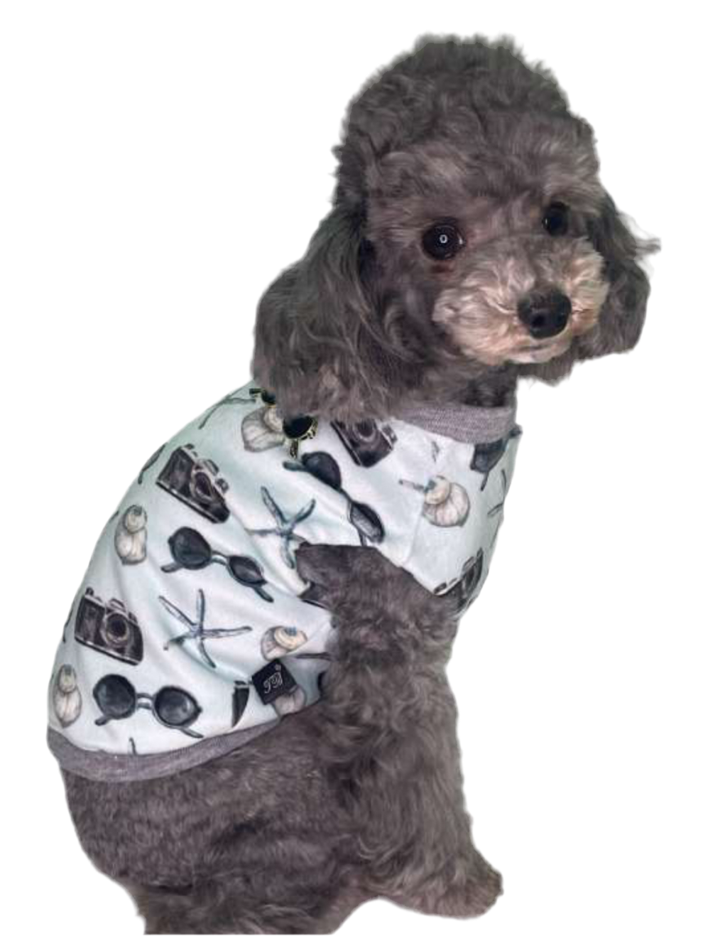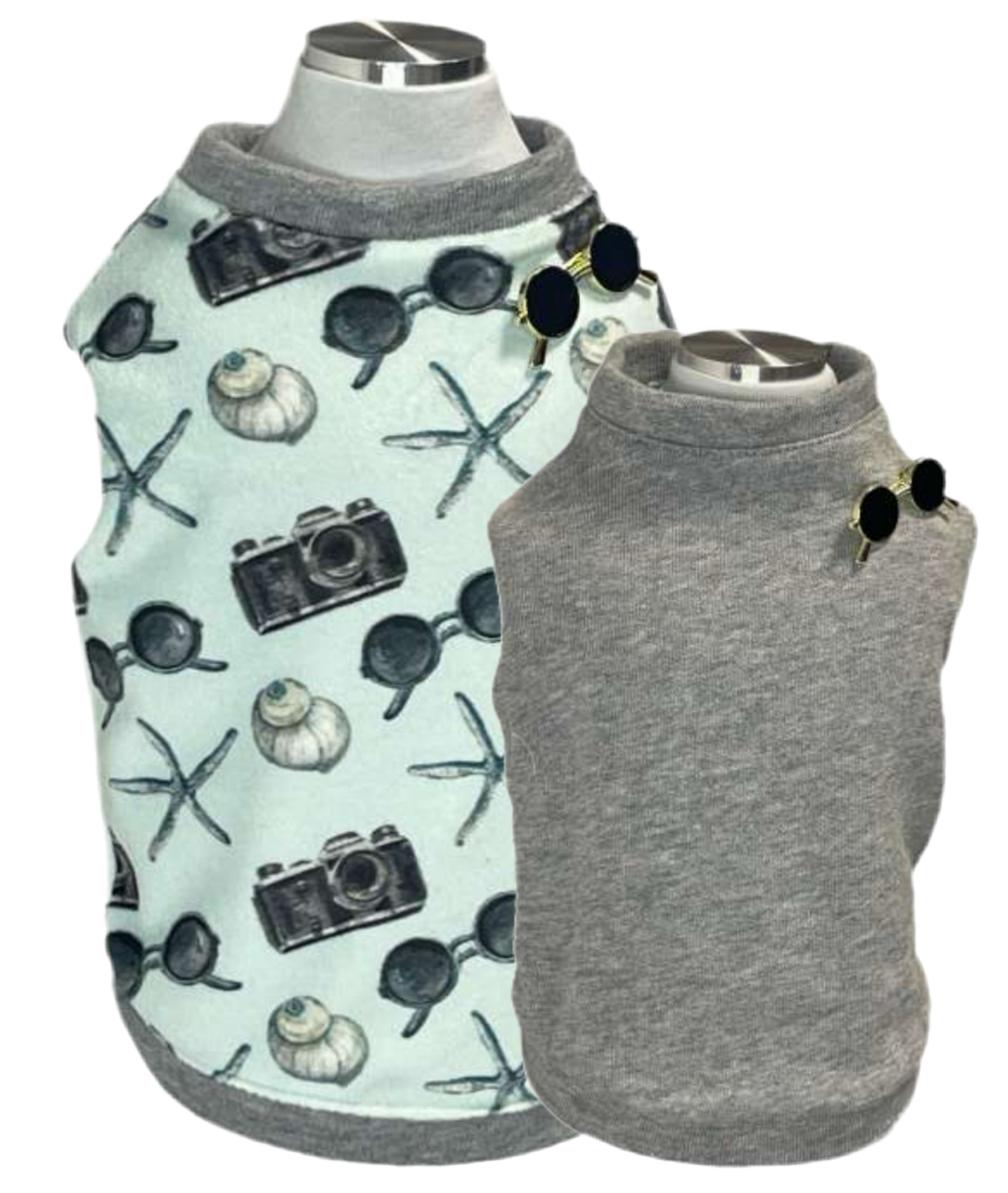 Felpina girocollo double-face con fantasia marinara con toni grigi arricchita con spilla sunglasses