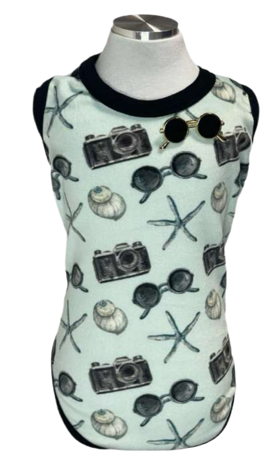 T shirt in cotone morbidissima con fantasia marina in toni grigi arricchita da spilla sunglasses