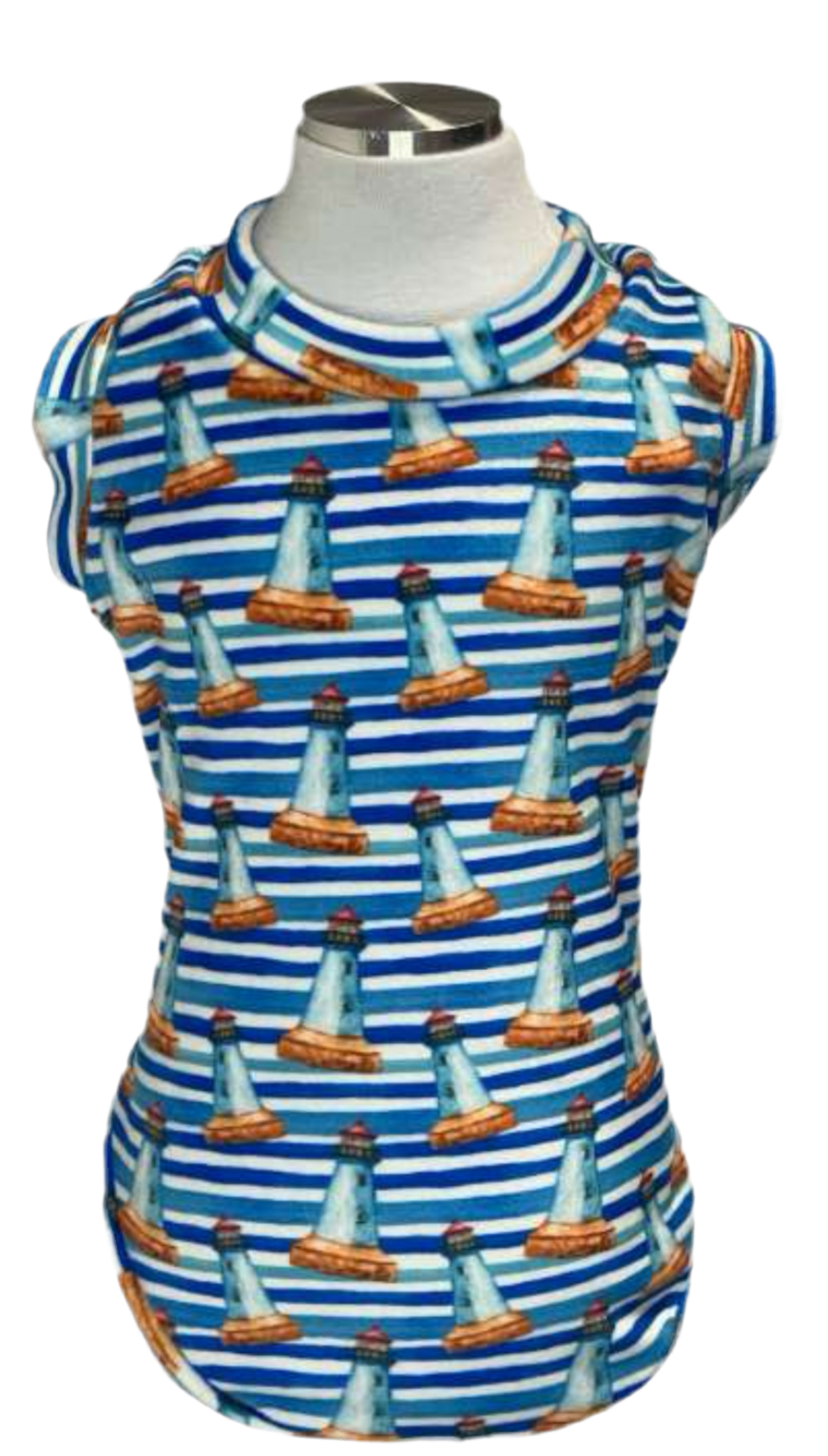 T shirt in ciniglia morbidissima con fantasia alla marinaretta e righe bianche e blu