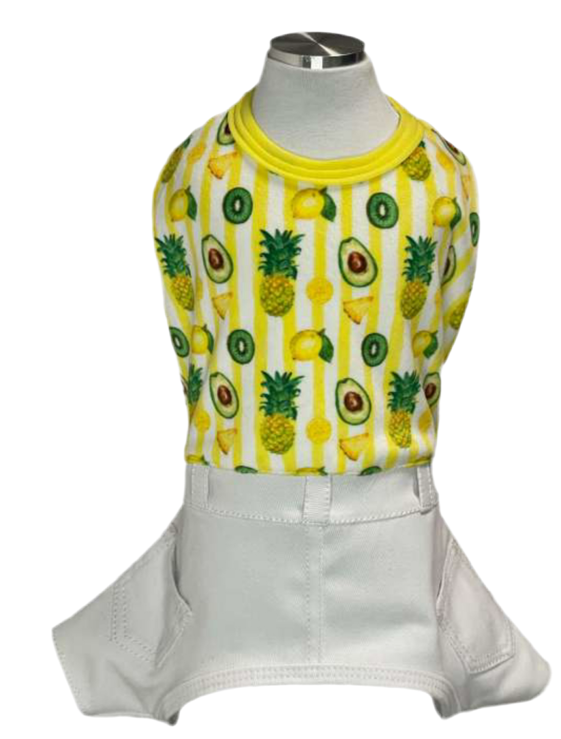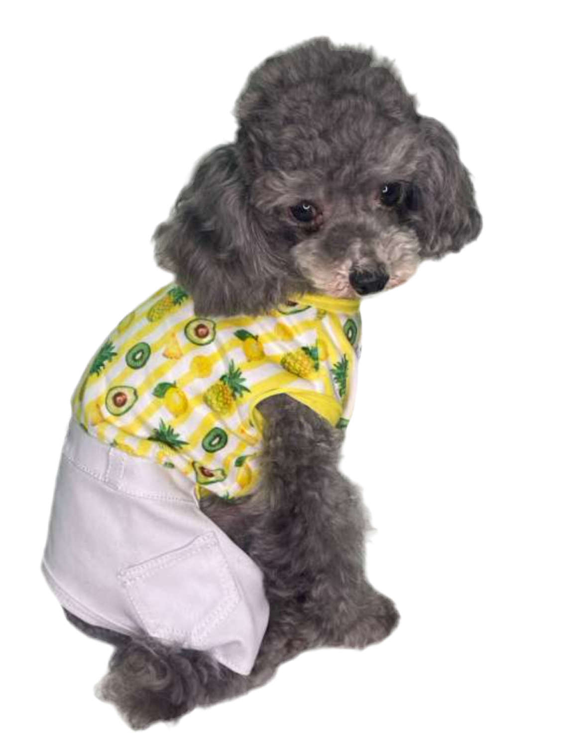 Dolcissima Tutina 4 zampe in ciniglia con fantasia a righe bianche e gialle con ananas e avocado e pantalone in jeans bianco