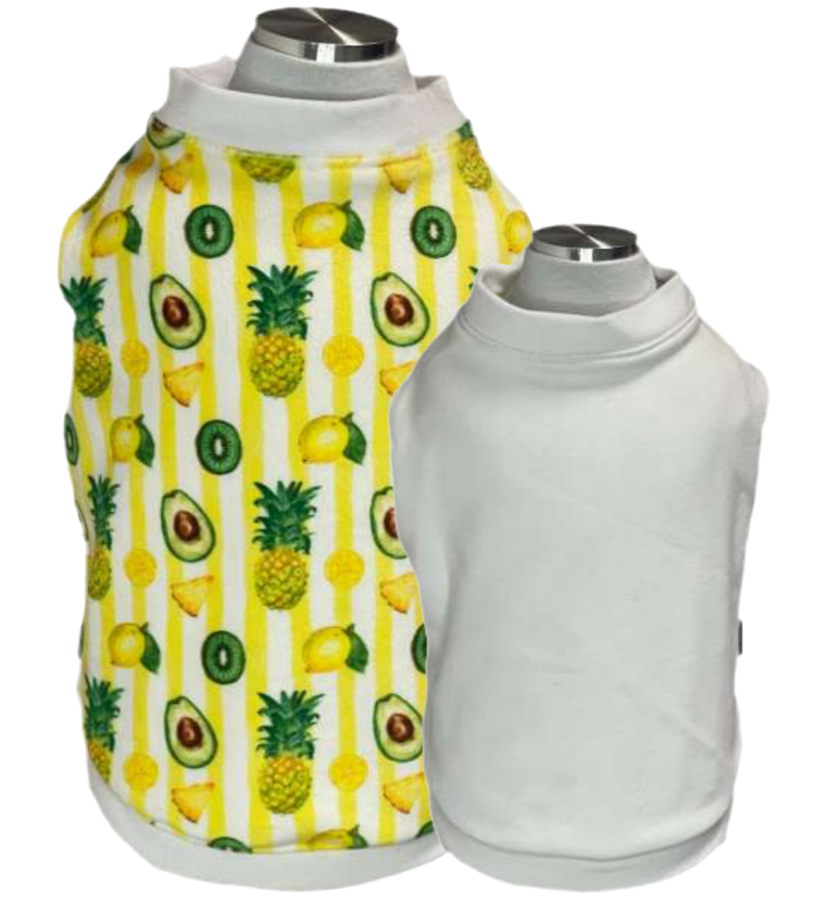 Felpina girocollo double-face con fantasia a righe bianche e gialle con ananas e avocado