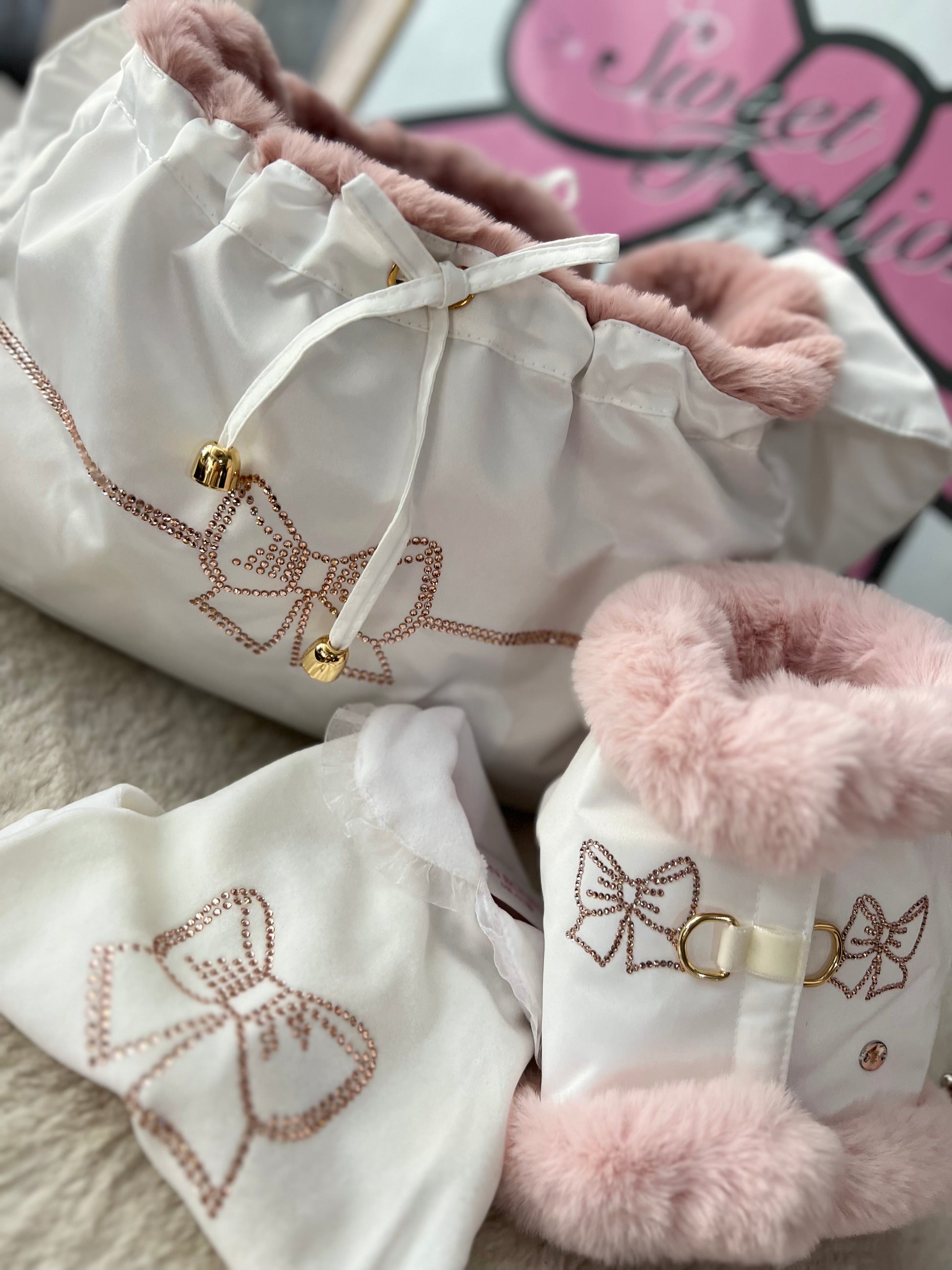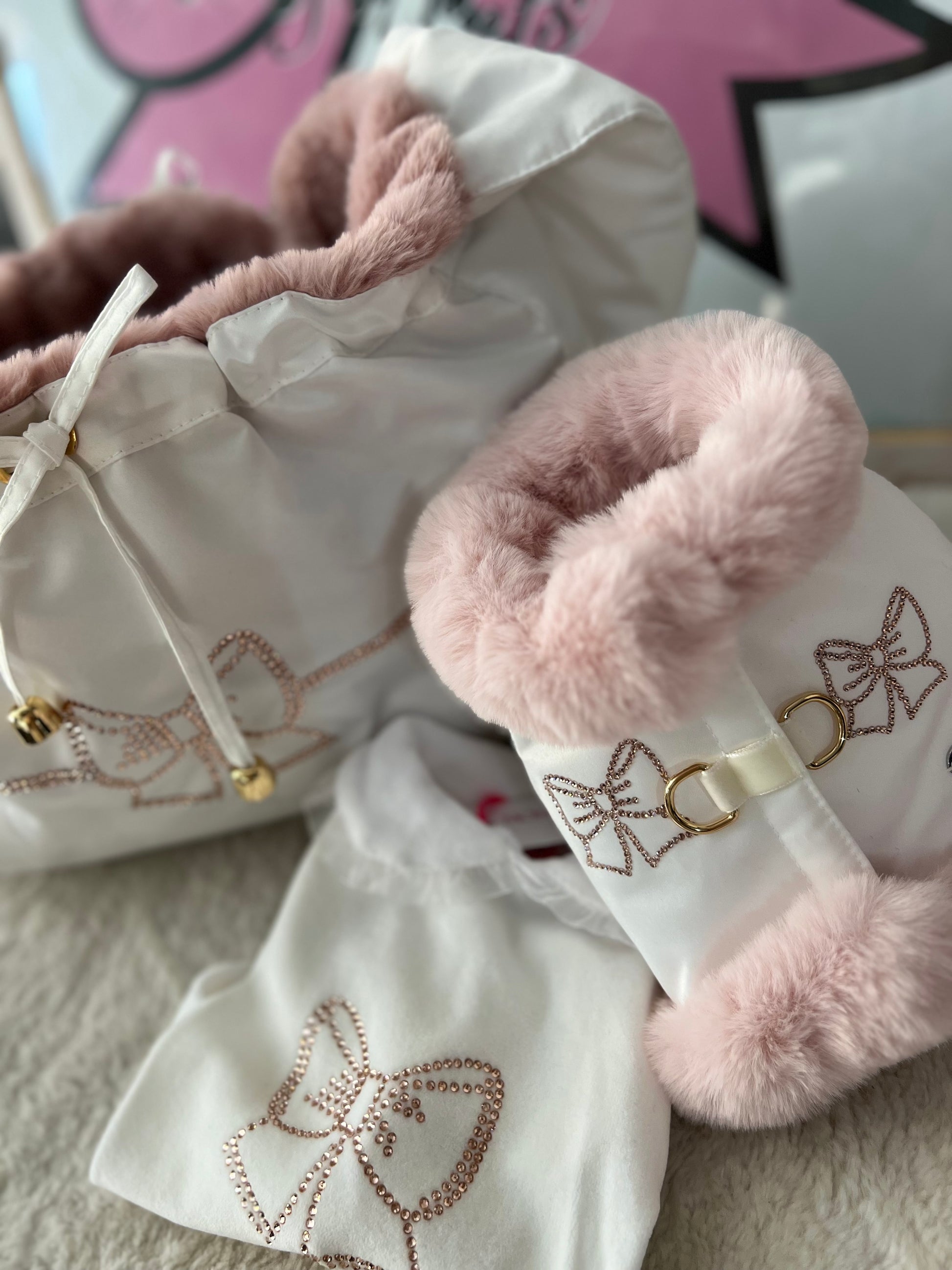 Monospalla romantico in tessuto tecnico Bianco , con patch preziosa a forma di fiocco , fatta interamente da cristalli swarovski Rosati , interno in morbido eco-fur Rosa