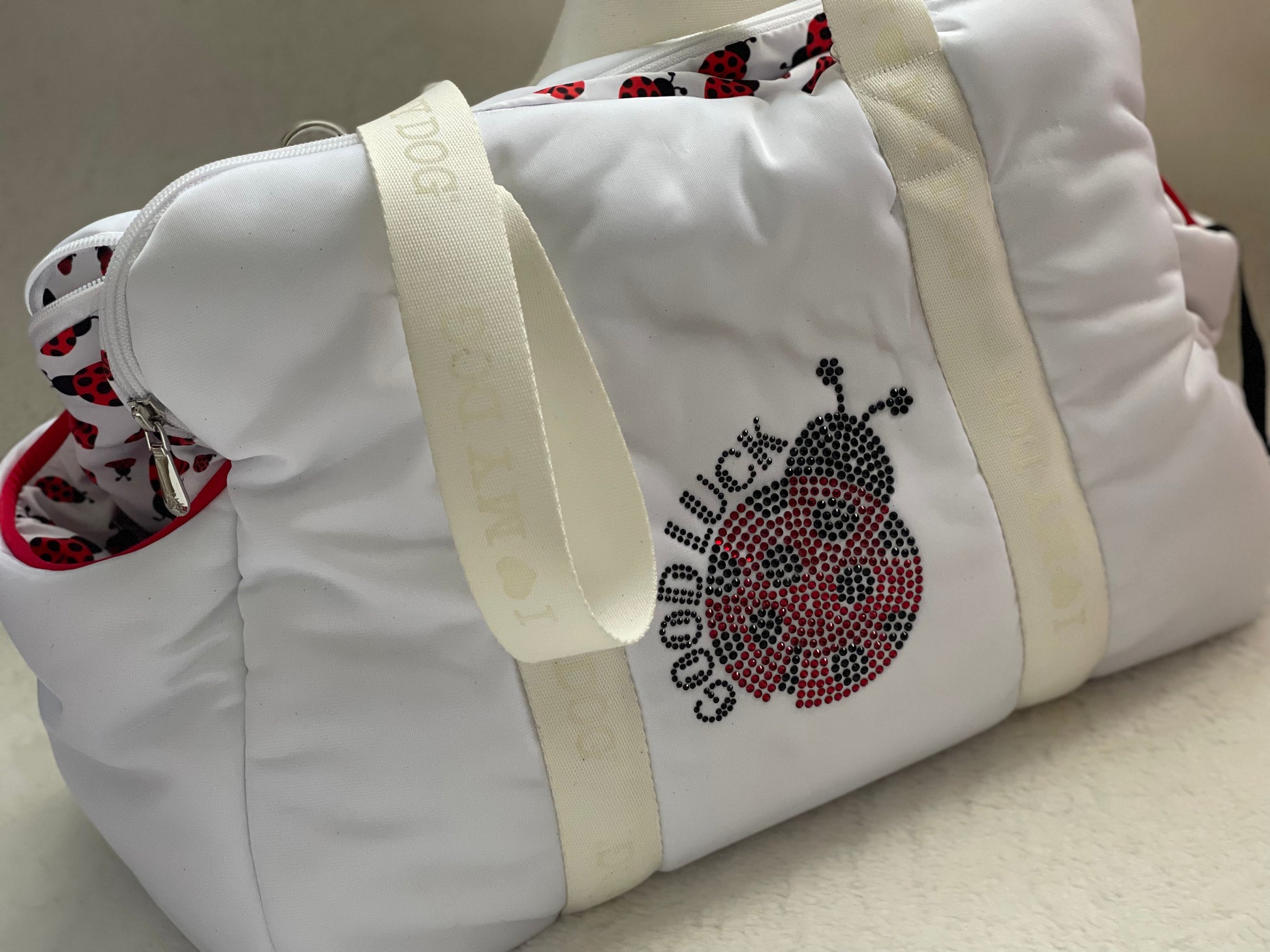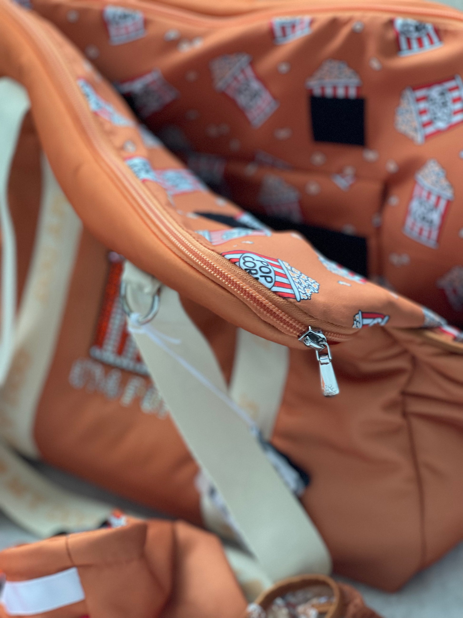 Borsa in felpa colorata, fodera interna in fresco jersey, doppie tasche con zip. Manico in nastro antiscivolo. All’interno doppio moschettone.