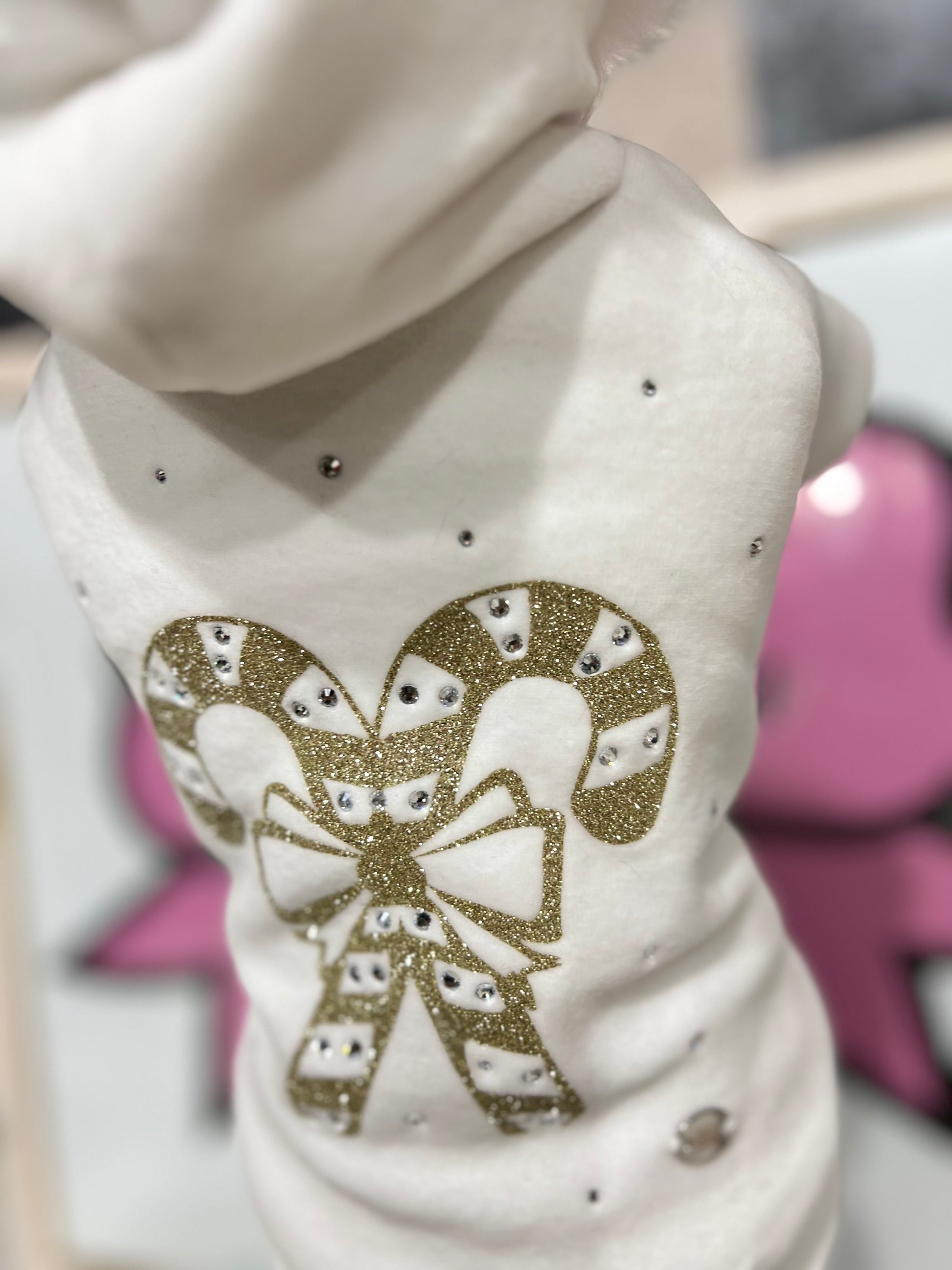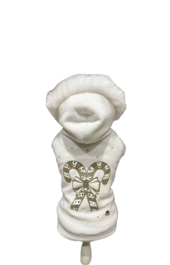 Elegante giacca in velluto Bianco arricchito da un patch di bastoncini di zuccheroin oro e cristalli swarovski , apertura sul pancinoin velcro e cappuccio arricchito da ecofur tono su tono
