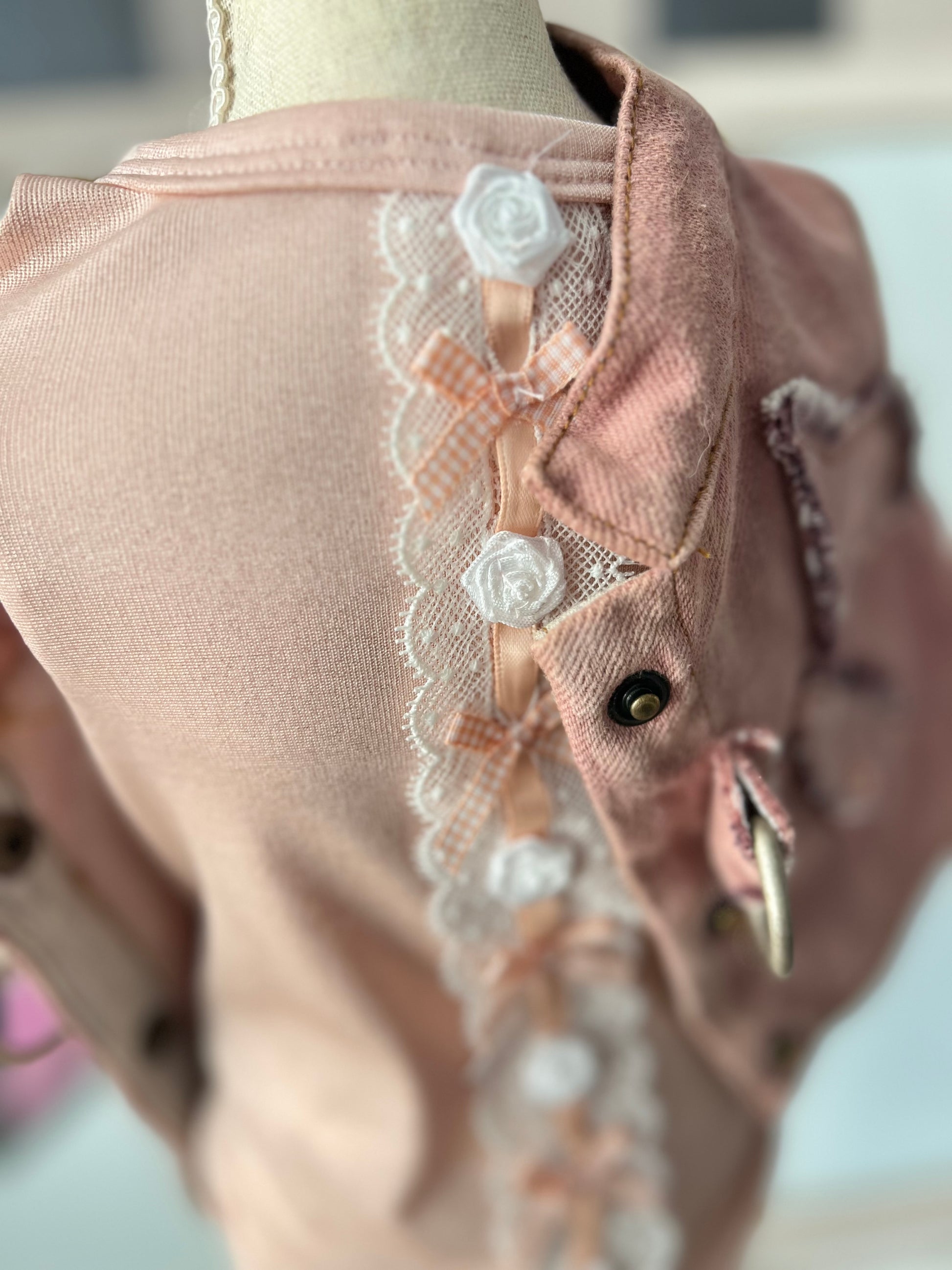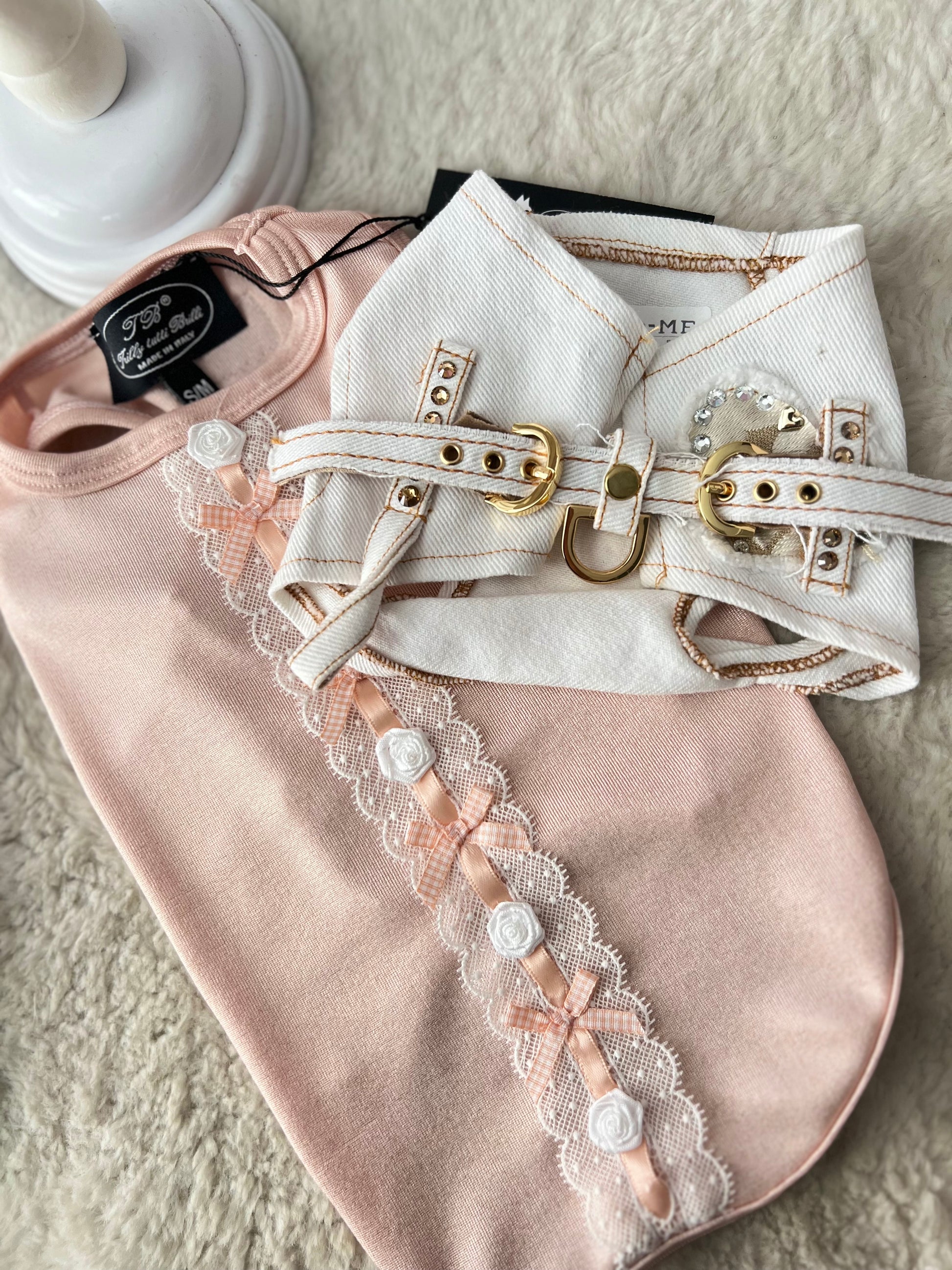 Dolcissima T-shirt in cotone elasticizzato effetto lurex , arricchita da pizzo e fiocchi