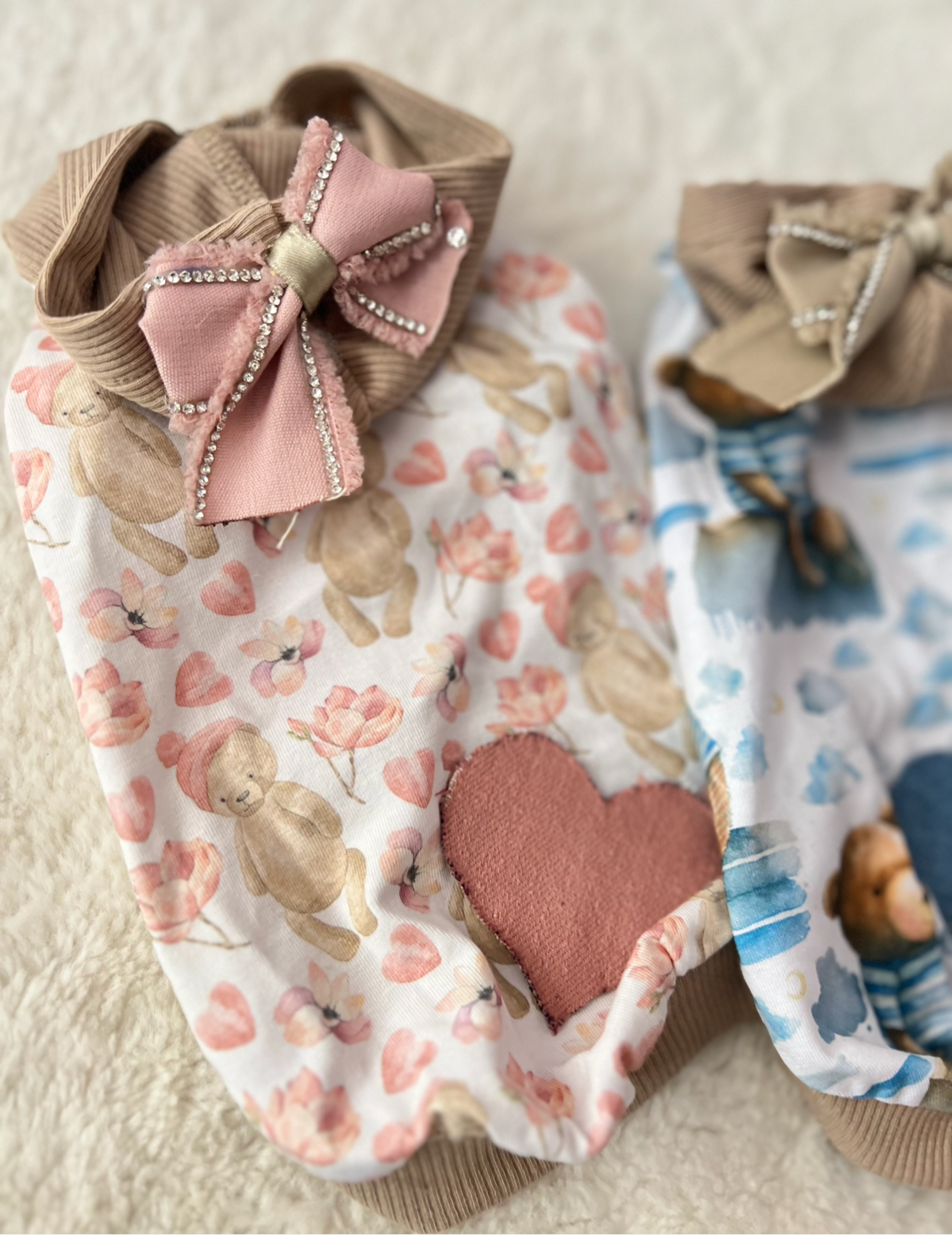 Dolcissima T-shirt in cotone con cappuccio a coste , stampa di orsetti dolcissimi , fiocco spilla e L immancabile cuore jeans shiko-me