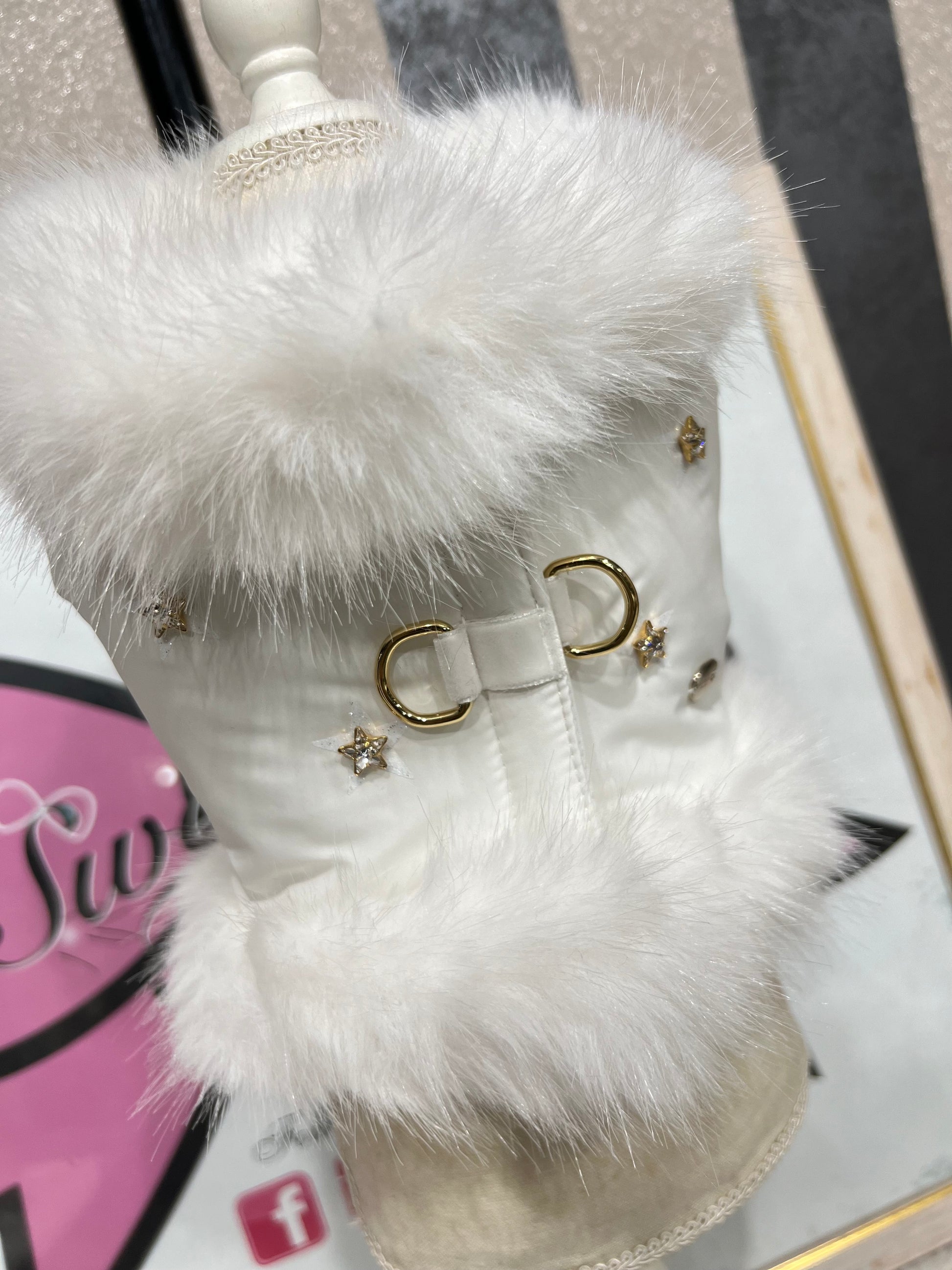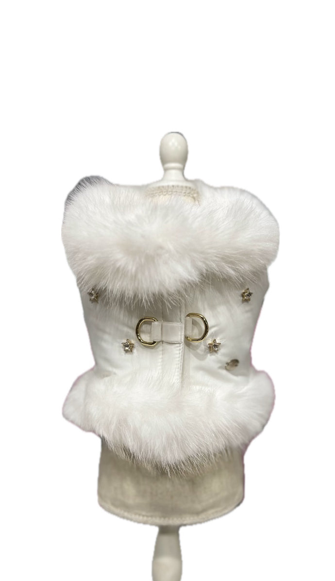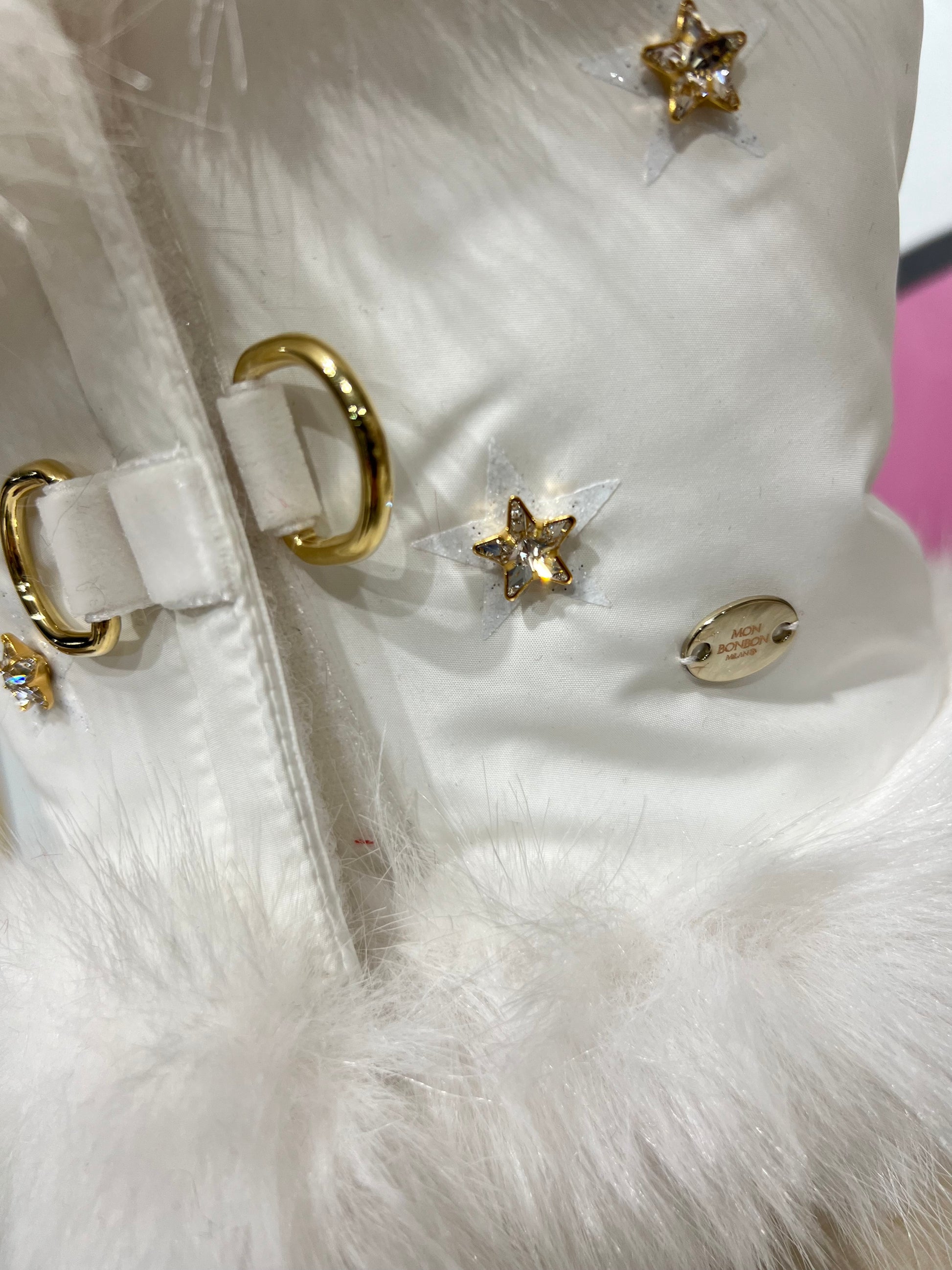 Elegante e preziosa pettorina Tailoring in Bianco con punti luce glitter stelle arricchiti ancosa di più da punti luce stella in veri cristalli swarovski , eco fur e interno rivestito in tessuto raso anti nodo