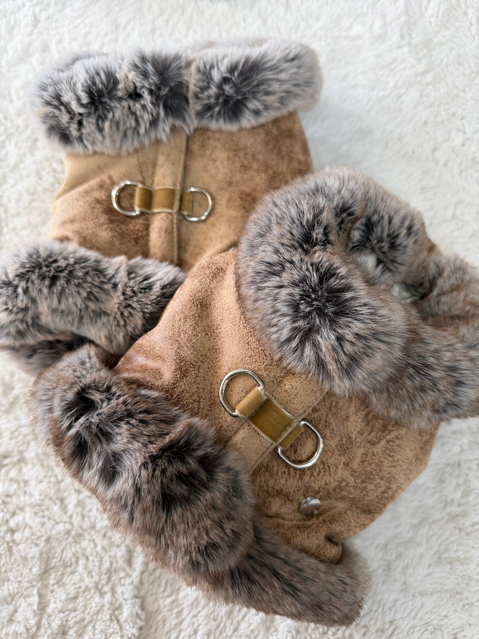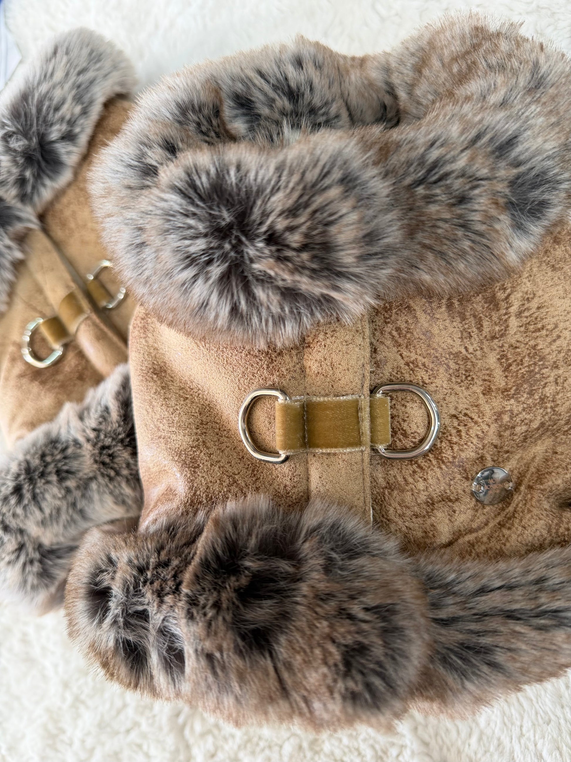 pettorina in ecopelle invecchiata chiara effetto vintage , è bordo ecofur cincilla
