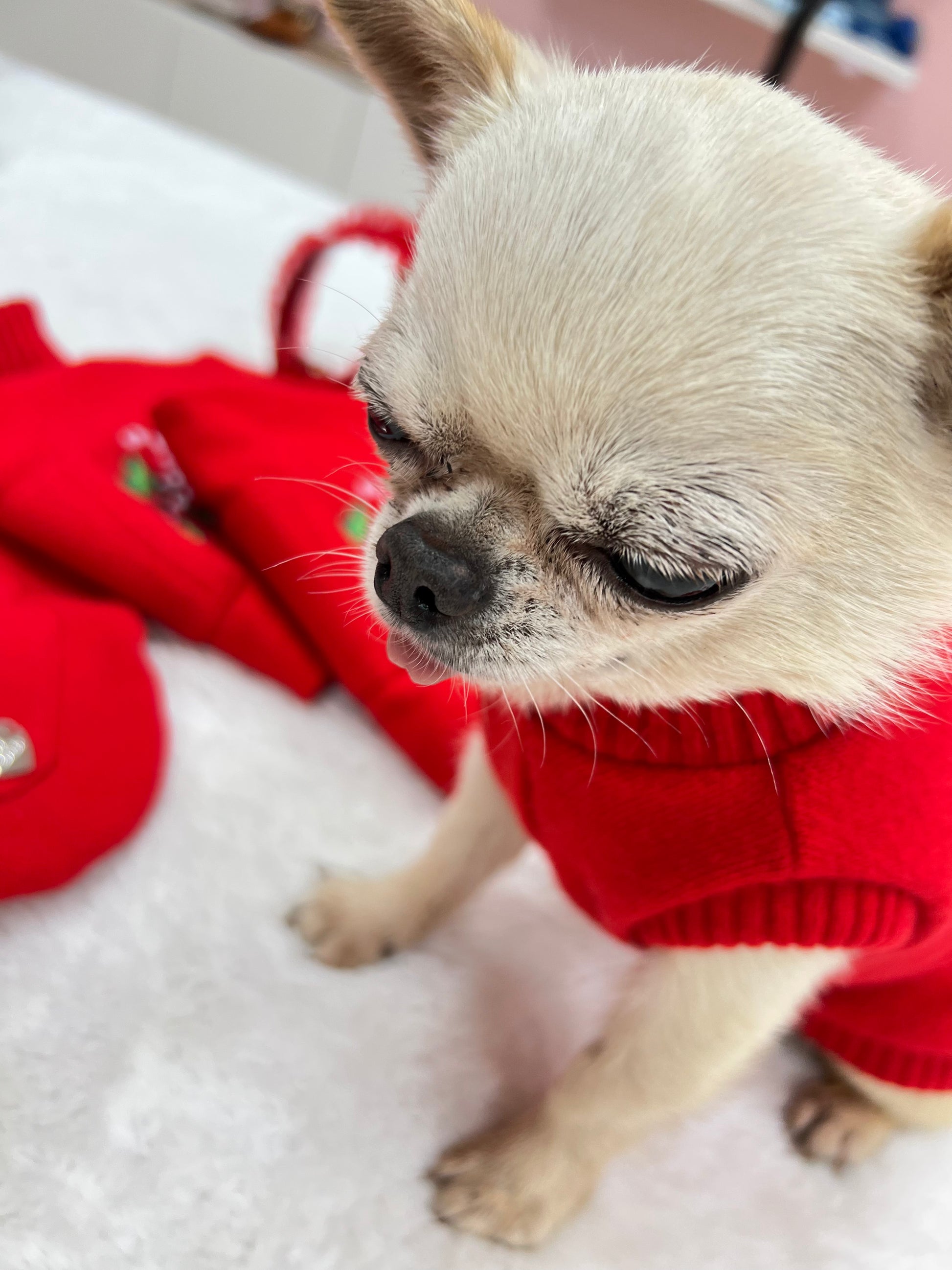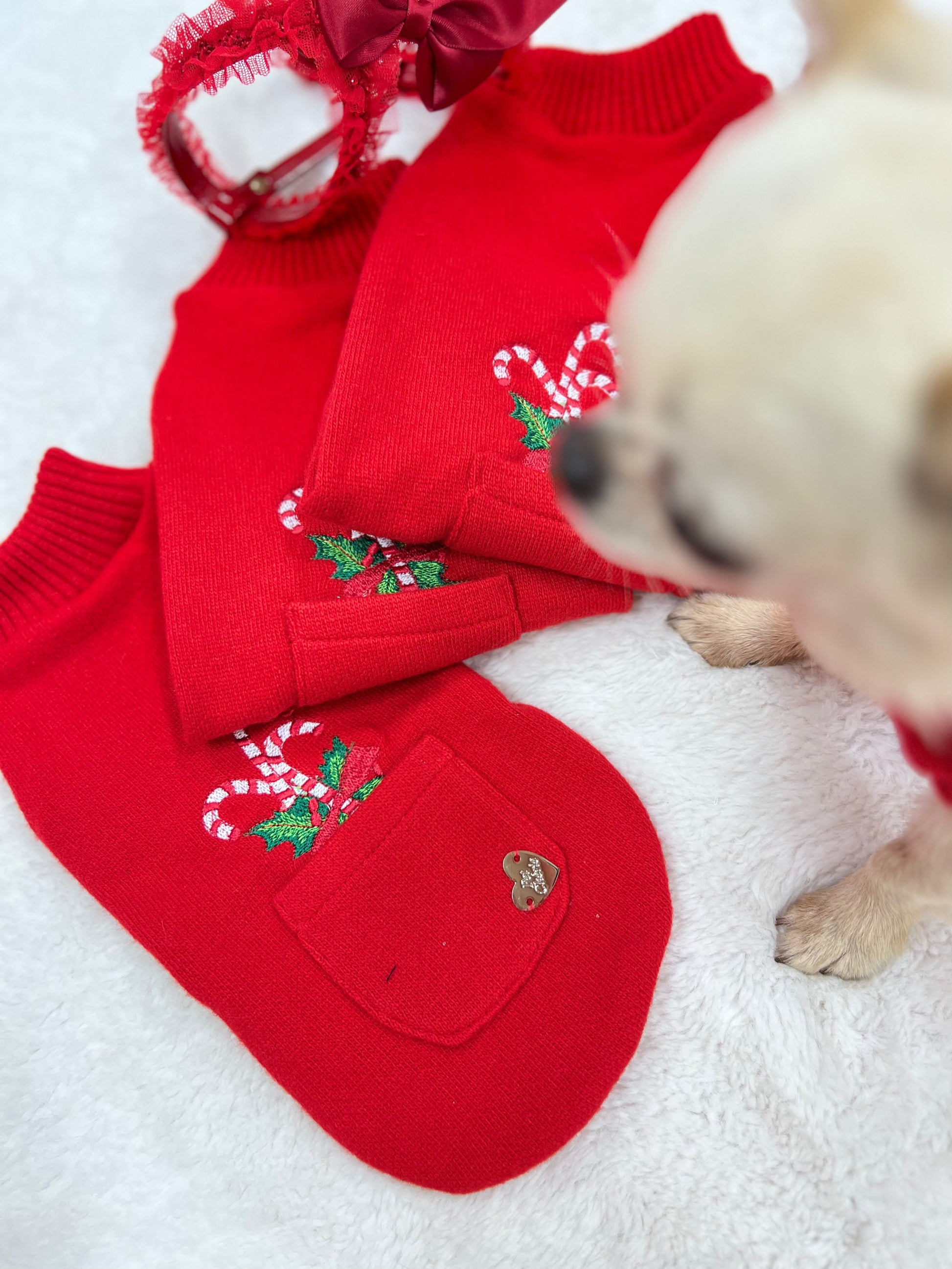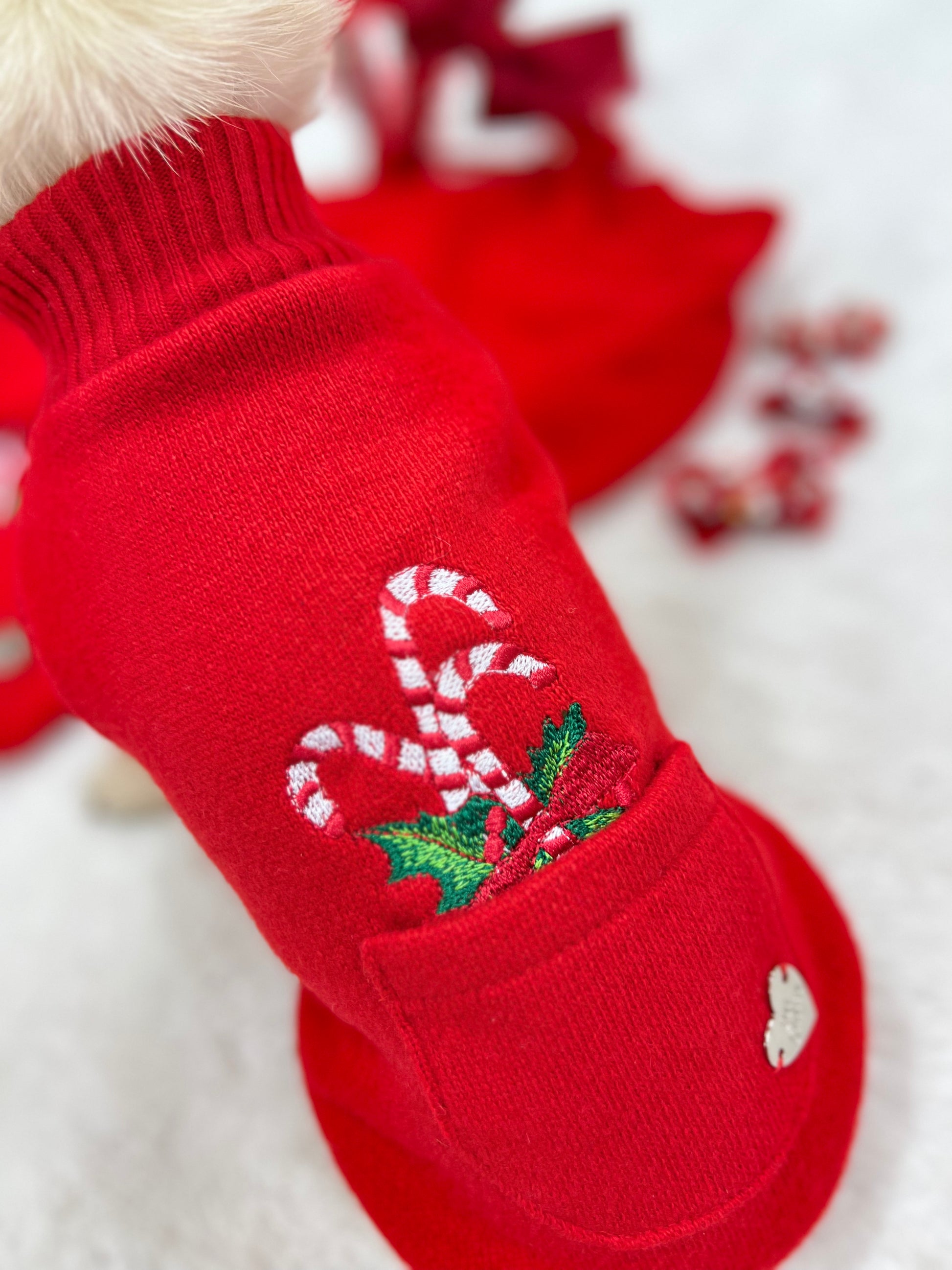 Morbido pull in colore rosso , con dolci bastoncini natalizi  ricamati